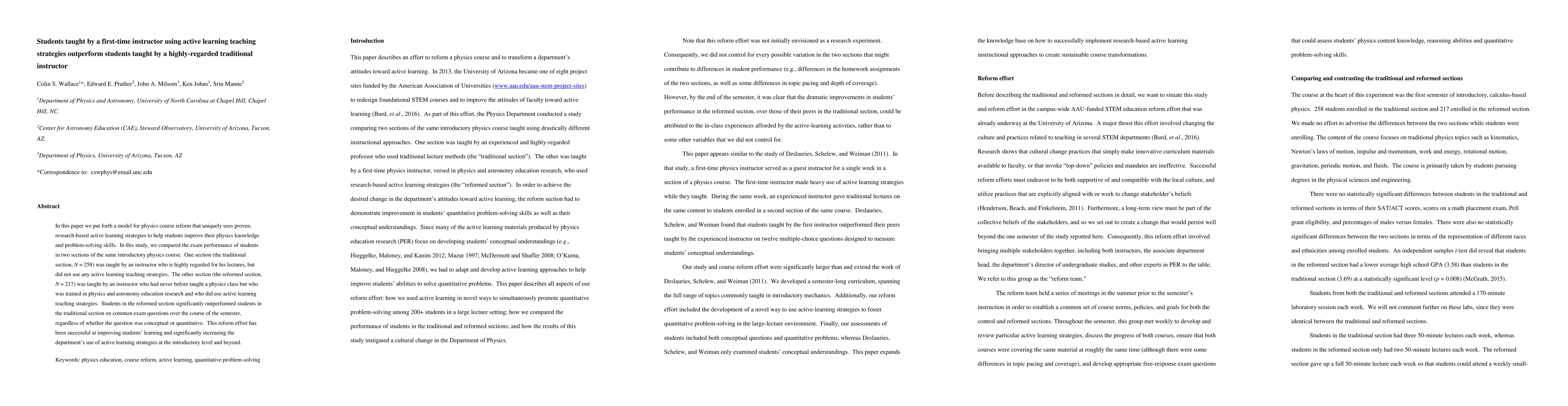 This study demonstrates that students taught by a first-time instructor using active learning strategies outperform those taught by a highly-regarded traditional instructor, showing significant improvement in exam performance across both conceptual and quantitative questions. The success of this reform encourages broader adoption of active learning in physics education.