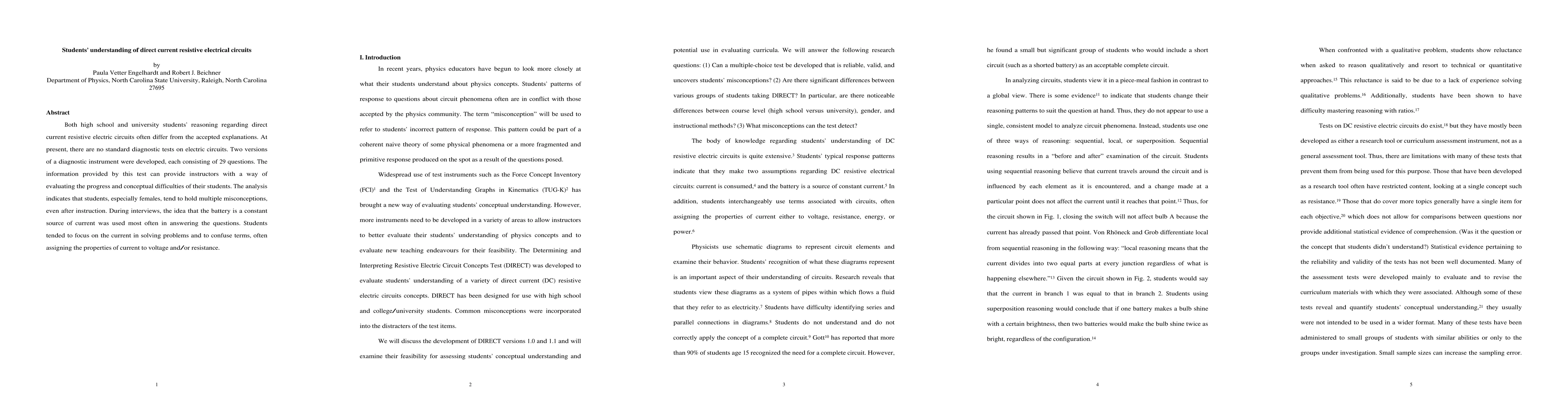 Research has shown that both high school and university students' reasoning patterns regarding direct current resistive electric circuits often differ from the currently accepted explanations. At present, there are no standard diagnostic examinations in electric circuits. Two versions of a diagnostic instrument called Determining and Interpreting Resistive Electric circuits Concepts Tests (DIRECT) were developed, each consisting of 29 questions. The information provided by the exam provides classroom instructors a means with which to evaluate the progress and conceptual difficulties of their students and their instructional methods. It can be used to evaluate curricular packages and/or other supplemental materials for their effectiveness in overcoming students' conceptual difficulties. The analyses indicate that students, especially females, tend to hold multiple misconceptions, even after instruction. During interviews, the idea that the battery is a constant source of current was used most often in answering the questions. Students tended to focus on current in solving the problems and to confuse terms, often assigning the properties of current to voltage and/or resistance. Results indicated that students do not have a clear understanding of the underlying mechanisms of electric circuit phenomena. On the other hand, students were able to translate easily from a "realistic" representation of a circuit to the corresponding schematic diagram.