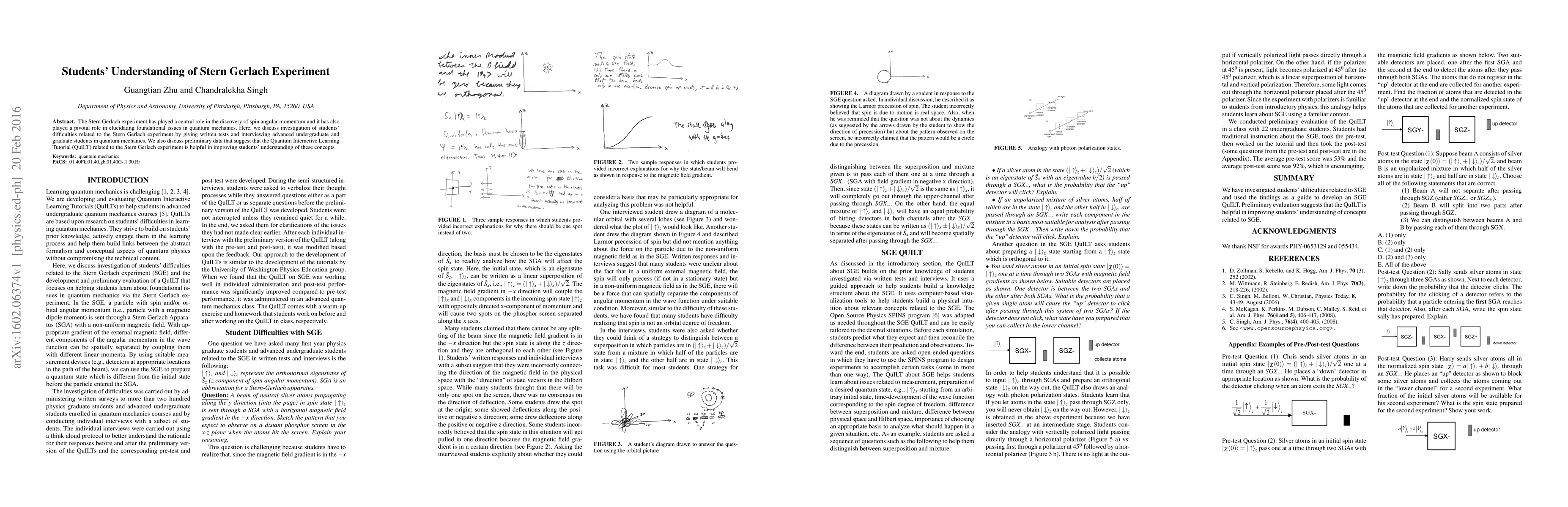 This study investigates advanced undergraduate and graduate students' understanding of the Stern Gerlach experiment, revealing common difficulties through written tests and interviews. Initial data suggest that the Quantum Interactive Learning Tutorial (QuILT) may enhance students' comprehension of related quantum mechanics concepts.