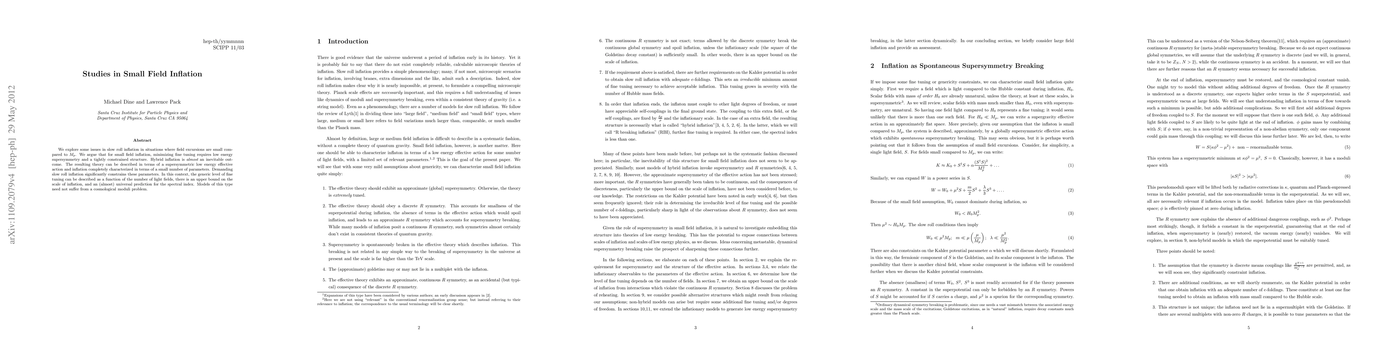 We explore some issues in slow roll inflation in situations where field excursions are small compared to $M_p$. We argue that for small field inflation, minimizing fine tuning requires low energy supersymmetry and a tightly constrained structure. Hybrid inflation is {\it almost} an inevitable outcome. The resulting theory can be described in terms of a supersymmetric low energy effective action and inflation completely characterized in terms of a small number of parameters. Demanding slow roll inflation significantly constrains these parameters. In this context, the generic level of fine tuning can be described as a function of the number of light fields, there is an upper bound on the scale of inflation, and an (almost) universal prediction for the spectral index. Models of this type need not suffer from a cosmological moduli problem.