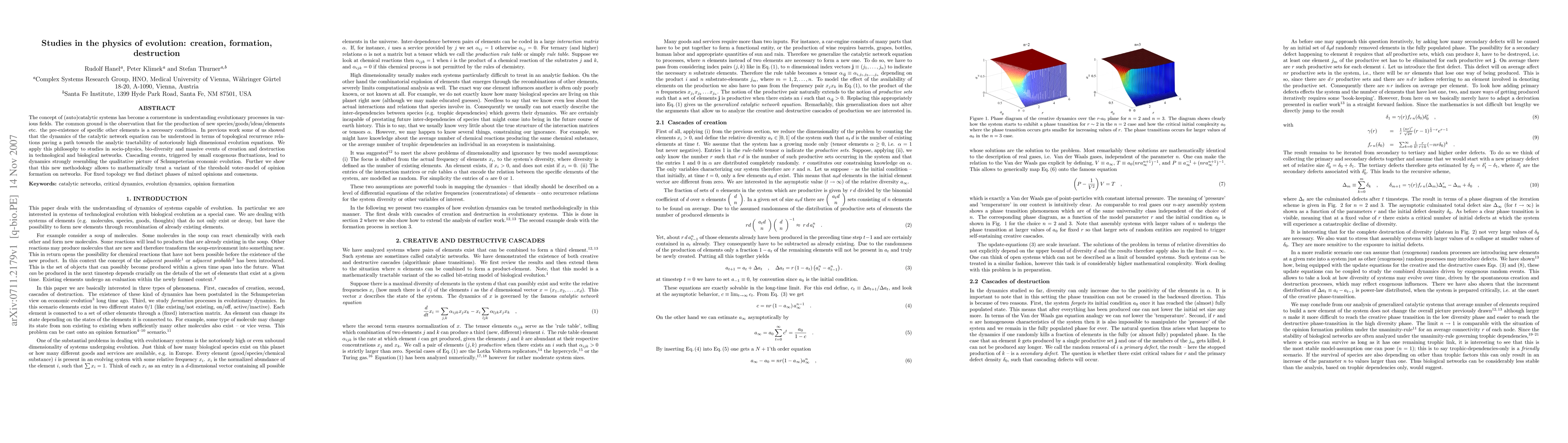 The concept of (auto)catalytic systems has become a cornerstone in understanding evolutionary processes in various fields. The common ground is the observation that for the production of new species/goods/ideas/elements etc. the pre-existence of specific other elements is a necessary condition. In previous work some of us showed that the dynamics of the catalytic network equation can be understood in terms of topological recurrence relations paving a path towards the analytic tractability of notoriously high dimensional evolution equations. We apply this philosophy to studies in socio-physics, bio-diversity and massive events of creation and destruction in technological and biological networks. Cascading events, triggered by small exogenous fluctuations, lead to dynamics strongly resembling the qualitative picture of Schumpeterian economic evolution. Further we show that this new methodology allows to mathematically treat a variant of the threshold voter-model of opinion formation on networks. For fixed topology we find distinct phases of mixed opinions and consensus.