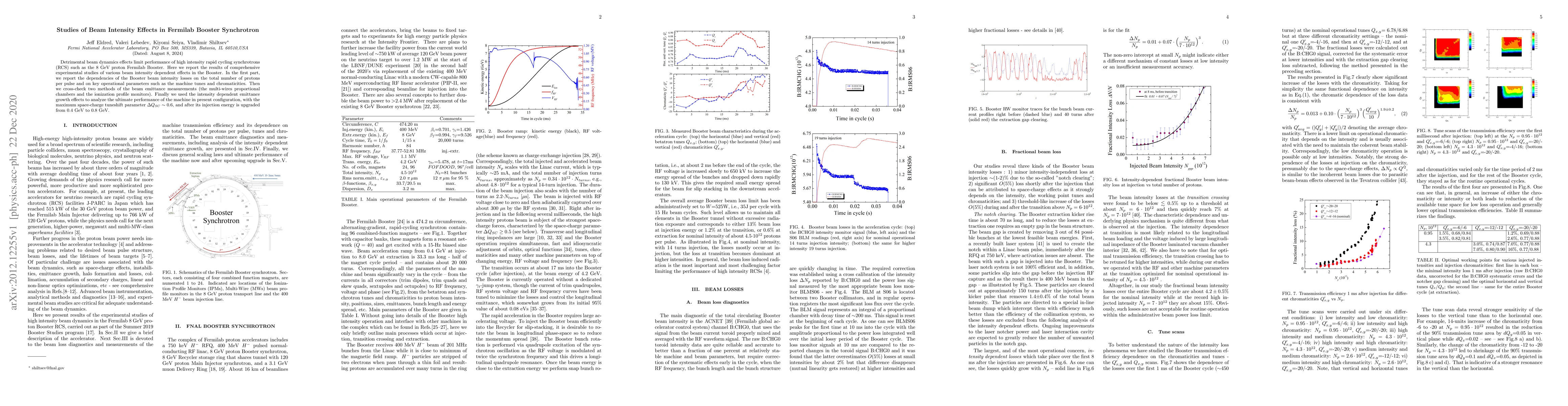 Detrimental beam dynamics effects limit performance of high intensity rapid cycling synchrotrons (RCS) such as the 8 GeV proton Fermilab Booster. Here we report the results of comprehensive experimental studies of various beam intensity dependent effects in the Booster. In the first part, we report the dependencies of the Booster beam intensity losses on the total number of protons per pulse and on key operational parameters such as the machine tunes and chromaticities. Then we cross-check two methods of the beam emittance measurements (the multi-wires proportional chambers and the ionization profile monitors). Finally we used the intensity dependent emittance growth effects to analyze the ultimate performance of the machine in present configuration, with the maximum space-charge tuneshift parameter Qsc of 0.6, and after its injection energy is upgraded from 0.4 GeV to 0.8 GeV.