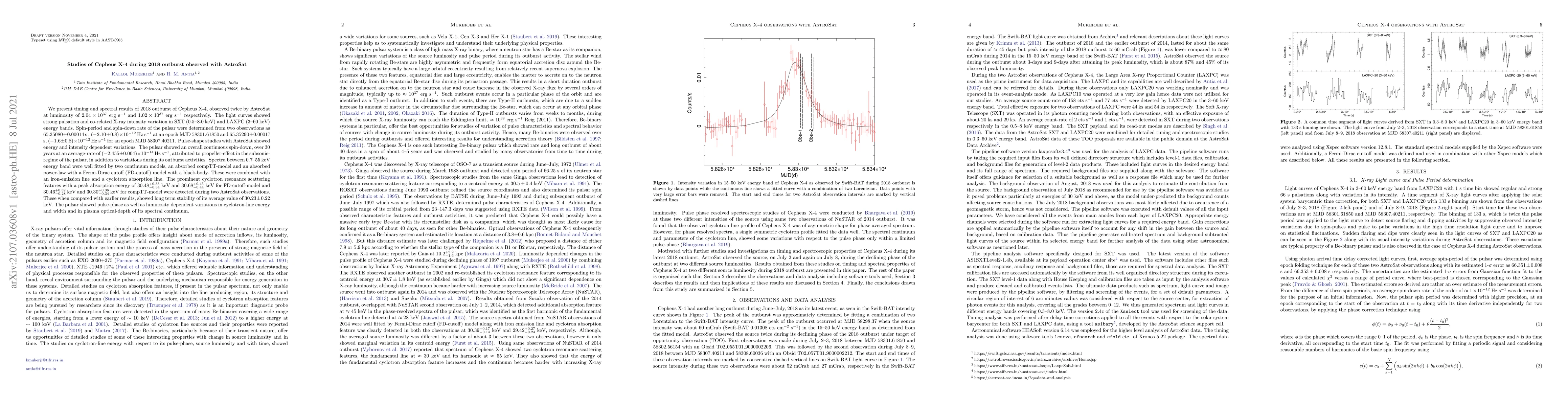 This research paper presents new observations of Cepheus X-4's 2018 outburst using AstroSat, revealing strong pulsation and variations in spin period and energy bands, as well as stability in its average cyclotron resonance line energy.