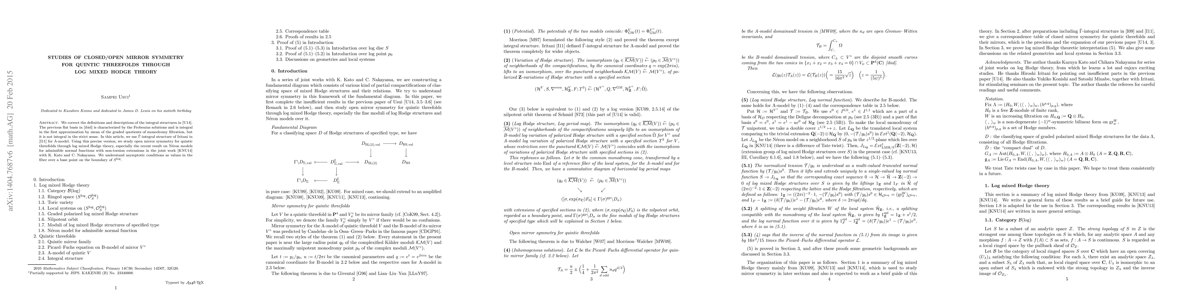 We correct the definitions and descriptions of the integral structures in [U14]. The previous flat basis in [ibid] is characterized by the Frobenius solutions and integral in the first approximation by mean of the graded quotients of monodromy filtration, but not integral in the strict sense. In this article, we use the integral structure of Iritani in [I11] for A-model. Using this precise version, we study open mirror symmetry for quintic threefolds through log mixed Hodge theory, especially the recent result on Neron models for admissible normal functions with non-torsion extensions in the joint work [KNU14] with K. Kato and C. Nakayama. We understand asymptotic conditions as values in the fiber over a base point on the boundary of S^{log}.