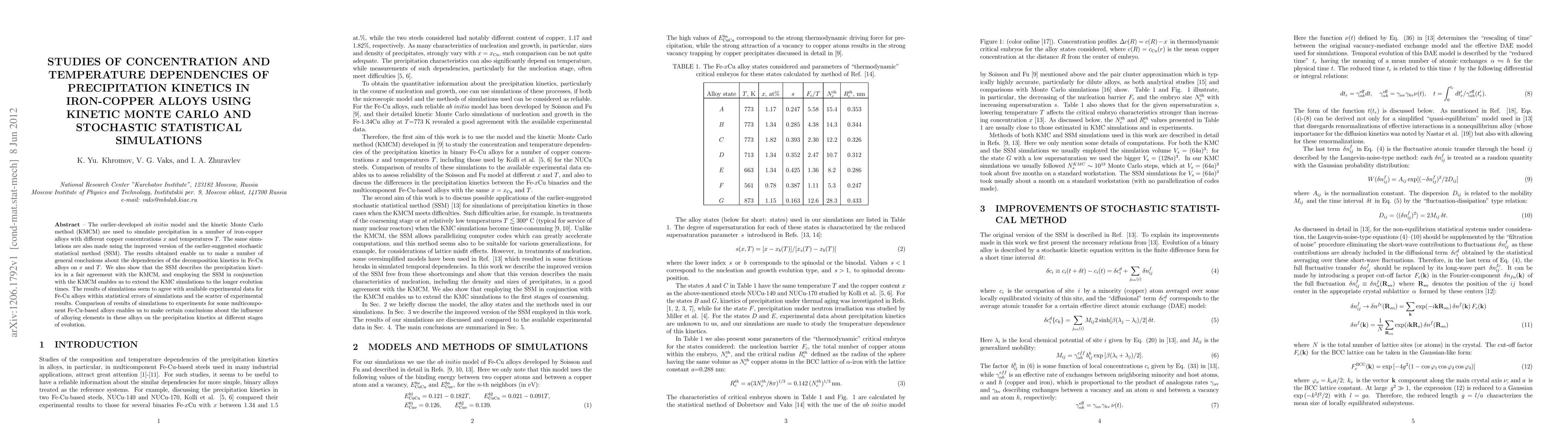 This study uses kinetic Monte Carlo and stochastic statistical simulations to investigate the precipitation kinetics in iron-copper alloys at varying copper concentrations and temperatures. The simulations show that the stochastic statistical method agrees well with the Monte Carlo results, allowing extended simulations and providing insights into the influence of alloying elements on precipitation kinetics.
