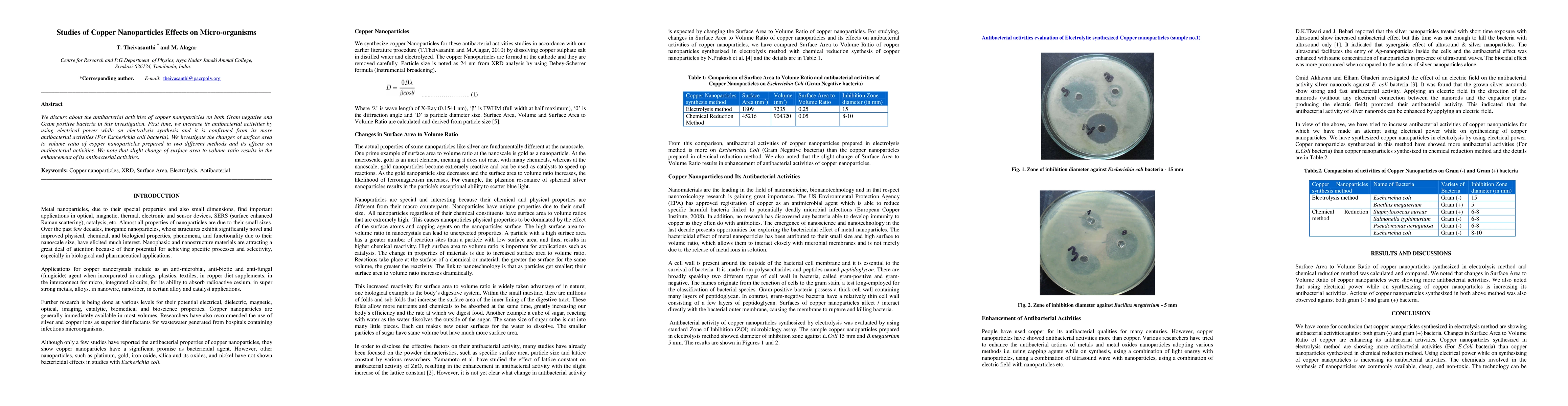 This study investigates the enhanced antibacterial activities of copper nanoparticles against Gram-negative and Gram-positive bacteria, particularly noting increased efficacy via electrolysis synthesis. The research also finds that minor changes in the surface area to volume ratio of the nanoparticles significantly boost their antibacterial properties.