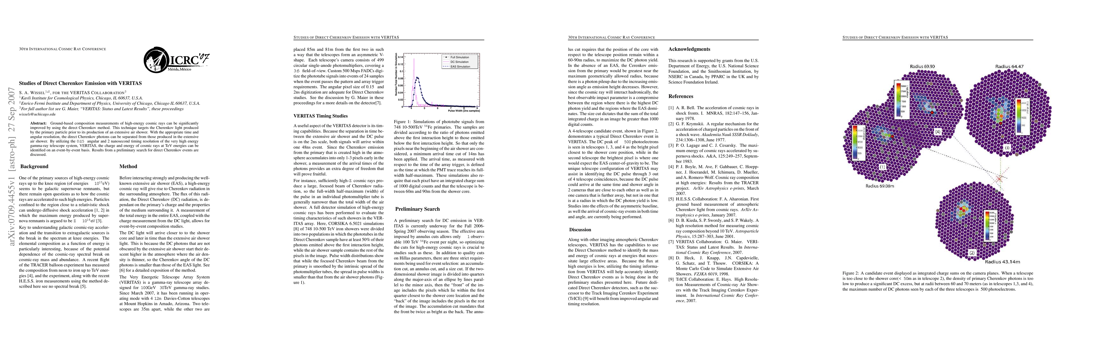 This paper explores the use of VERITAS to measure high-energy cosmic rays via direct Cherenkov emission, improving ground-based composition measurements. Preliminary results indicate the potential of this method to identify cosmic ray charge and energy at TeV energies with high time and angular resolution.