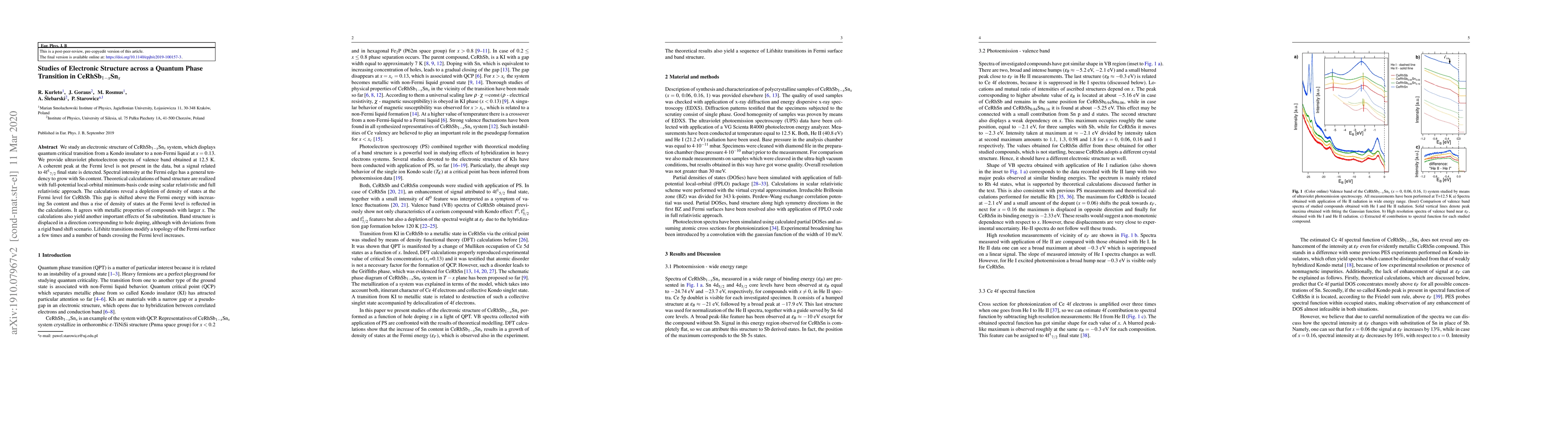 We study an electronic structure of CeRhSb$_{1-x}$Sn$_x$ system, which displays quantum critical transition from a Kondo insulator to a non-Fermi liquid at $x=0.13$. We provide ultraviolet photoelectron spectra of valence band obtained at 12.5 K. Acoherent peak at the Fermi level is not present in the data, but a signal related to 4f$^1$$_{7/2}$ final state is detected. Spectral intensity at the Fermi edge has a general tendency to grow with Sn content. Theoretical calculations of band structure are realized with full-potential local-orbital minimum-basis code using scalar relativistic and full relativistic approach. The calculations reveal a depletion of density of states at the Fermi level for CeRhSb. This gap is shifted above the Fermi energy with increasing Sn content and thus a rise of density of states at the Fermi level is reflected in the calculations. It agrees with metallic properties of compounds with larger $x$. The calculations also yield another important effects of Sn substitution. Band structure is displaced in a direction corresponding to hole doping, although with deviations from a rigid band shift scenario. Lifshitz transitions modify a topology of the Fermi surface a few times and a number of bands crossing the Fermi level increases.