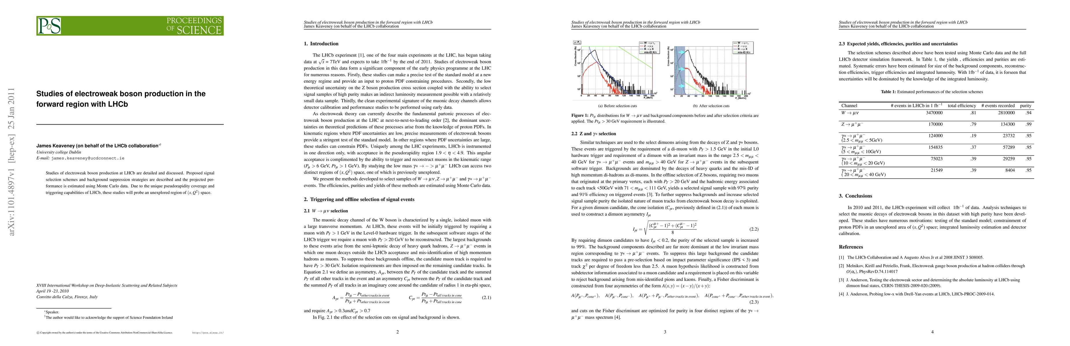 This paper details studies on electroweak boson production in the forward region using the LHCb detector, outlining signal selection and background suppression methods, and estimating performance via Monte Carlo simulations. LHCb's unique coverage and triggering capabilities enable exploration of new regions in x, Q^2 space.