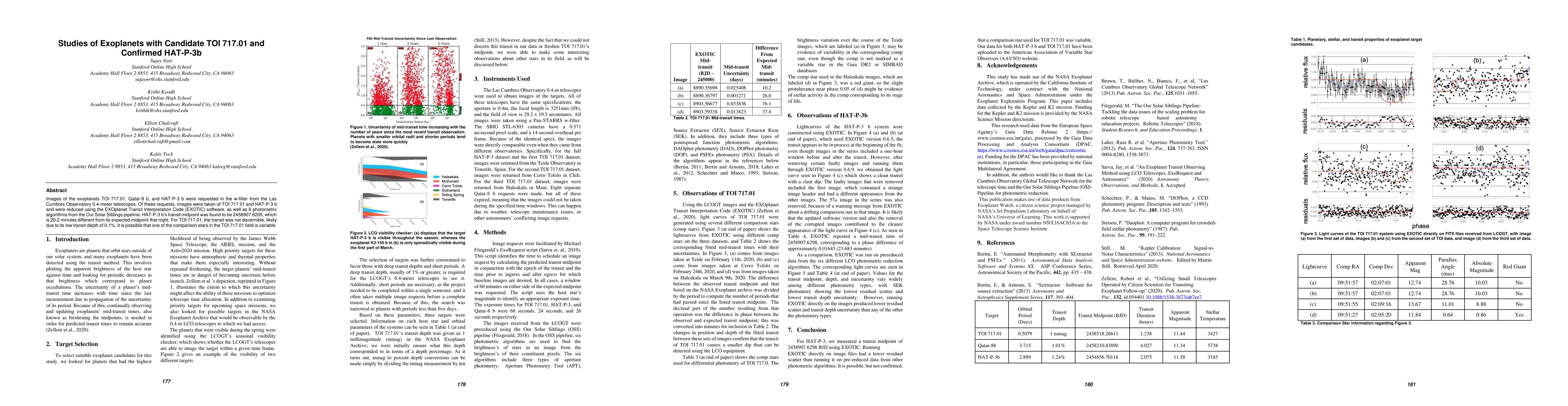 Images of the exoplanets TOI 717.01, Qatar-8 b, and HAT-P-3 b were requested in the w-filter from the Las Cumbres Observatory 0.4-meter telescopes. Of these requests, images were taken of TOI 717.01 and HAT-P-3b and were reduced using the EXOplanet Transit Interpretation Code (EXOTIC) software, as well as 6 photometric algorithms from the Our Solar Siblings pipeline. The transit midpoint for HAT-P-3 b was found to be 2458907.6205, which is 20.2 minutes different from its expected midpoint that night. For TOI 717.01, the transit was not discernible, likely due to its low transit depth of 0.1%. It is possible that one of the comparison stars in the TOI 717.01 field is variable.