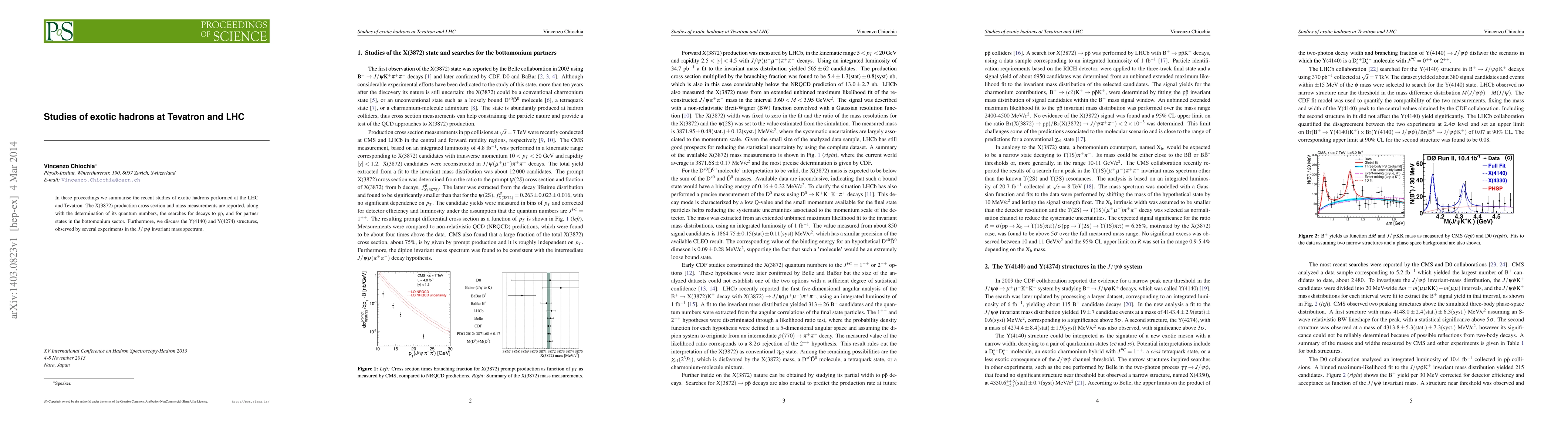 This paper summarizes recent studies of exotic hadrons at the LHC and Tevatron, focusing on the X(3872) production cross section, mass measurements, quantum numbers, and searches for decays and partner states. It also discusses the Y(4140) and Y(4274) structures observed in the $J/\psi\phi$ invariant mass spectrum.