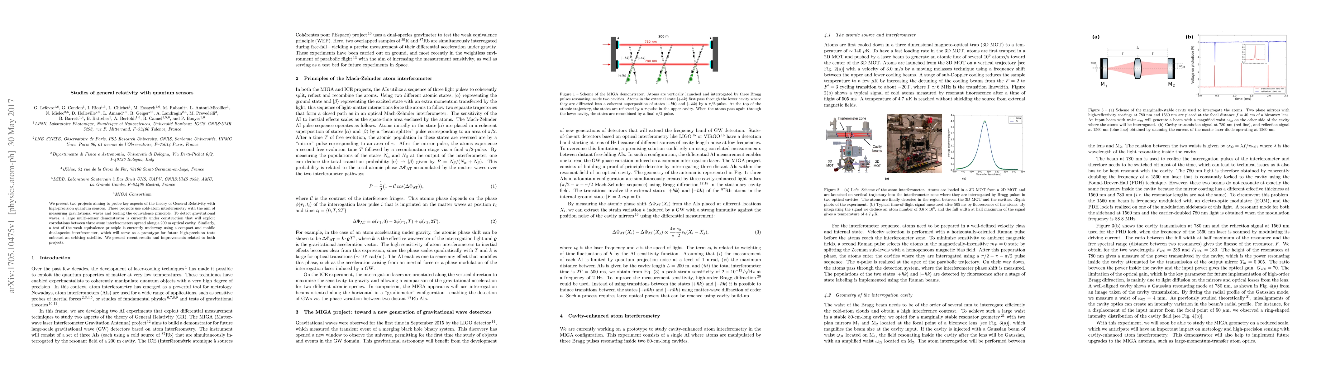 We present two projects aiming to probe key aspects of the theory of General Relativity with high-precision quantum sensors. These projects use cold-atom interferometry with the aim of measuring gravitational waves and testing the equivalence principle. To detect gravitational waves, a large multi-sensor demonstrator is currently under construction that will exploit correlations between three atom interferometers spread along a 200 m optical cavity. Similarly, a test of the weak equivalence principle is currently underway using a compact and mobile dual-species interferometer, which will serve as a prototype for future high-precision tests onboard an orbiting satellite. We present recent results and improvements related to both projects.