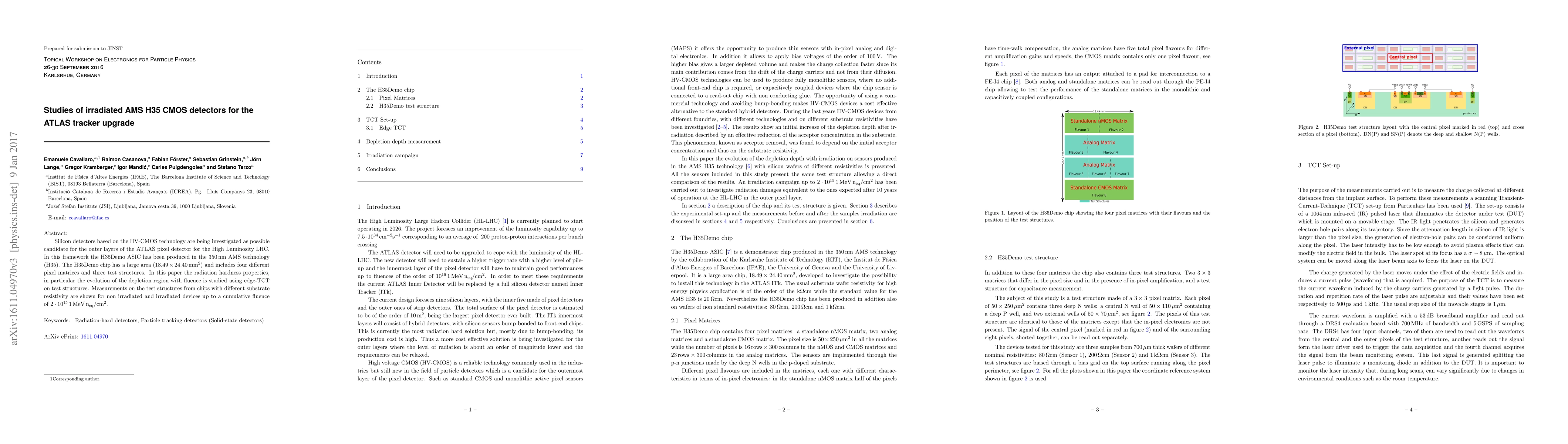 Silicon detectors based on the HV-CMOS technology are being investigated as possible candidate for the outer layers of the ATLAS pixel detector for the High Luminosity LHC. In this framework the H35Demo ASIC has been produced in the 350 nm AMS technology (H35). The H35Demo chip has a large area ($18.49 \times 24.40 \, \mathrm{mm^2}$) and includes four different pixel matrices and three test structures. In this paper the radiation hardness properties, in particular the evolution of the depletion region with fluence is studied using edge-TCT on test structures. Measurements on the test structures from chips with different substrate resistivity are shown for non irradiated and irradiated devices up to a cumulative fluence of $2 \cdot 10^{15} \, \mathrm{1\,MeV\, n_{eq} / cm^{2}}$.