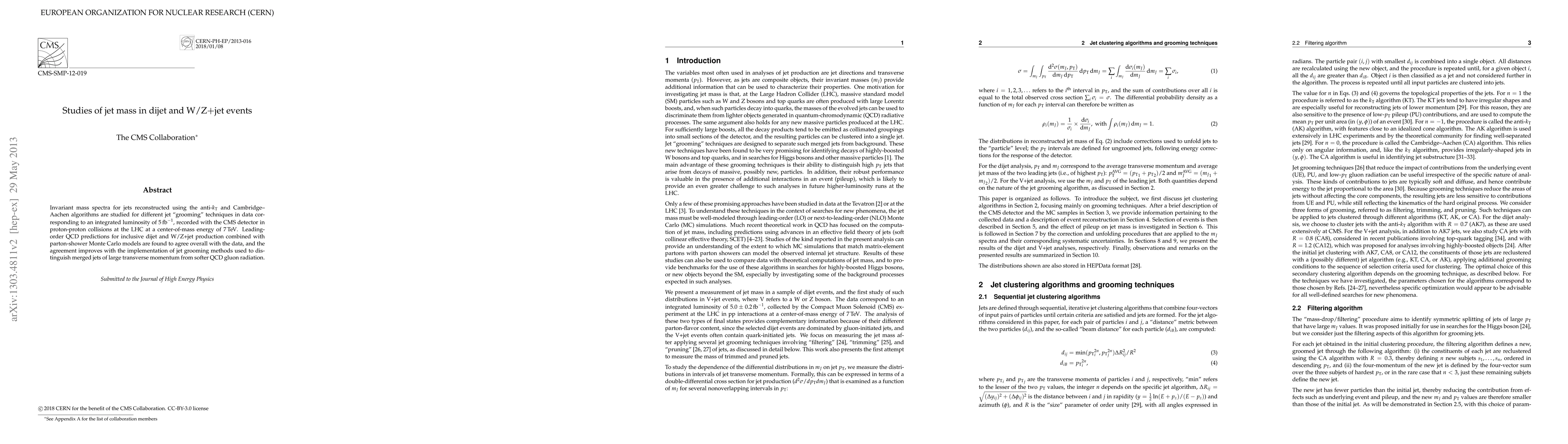 This study investigates the invariant mass spectra of jets using anti-kt and Cambridge-Aachen algorithms in dijet and W/Z + jet events from LHC proton-proton collisions at 7 TeV. The research finds that leading-order QCD predictions align well with the data, with improved agreement achieved through jet grooming techniques that separate high-momentum merged jets from softer QCD radiation.