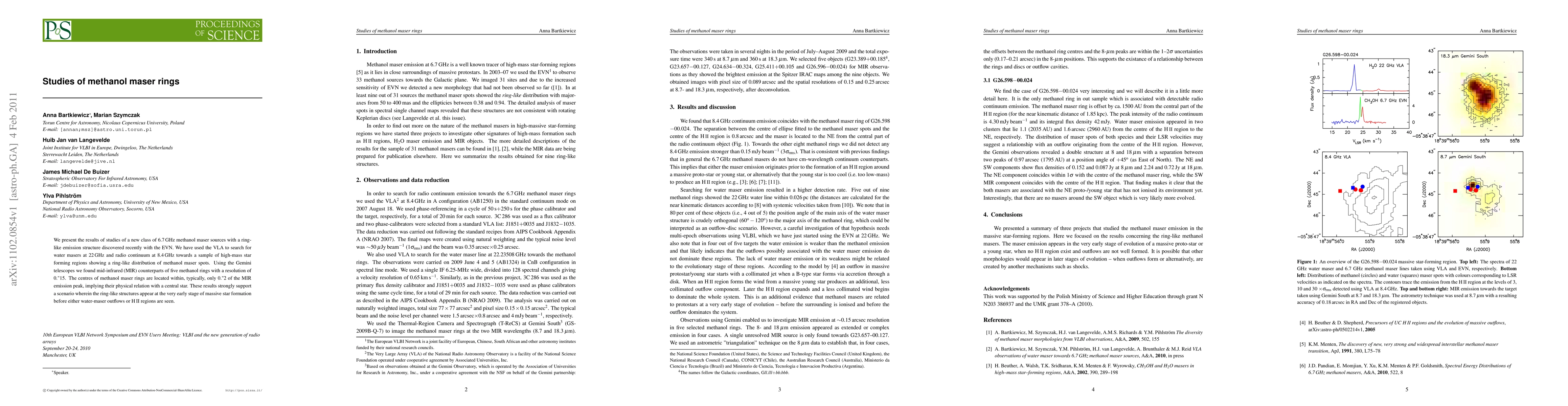 We present the results of studies of a new class of 6.7 GHz methanol maser sources with a ring-like emission structure discovered recently with the EVN. We have used the VLA to search for water masers at 22 GHz and radio continuum at 8.4 GHz towards a sample of high-mass star forming regions showing a ring-like distribution of methanol maser spots. Using the Gemini telescopes we found mid-infrared (MIR) counterparts of five methanol rings with a resolution of 0."15. The centres of methanol maser rings are located within, typically, only 0."2 of the MIR emission peak, implying their physical relation with a central star. These results strongly support a scenario wherein the ring-like structures appear at the very early stage of massive star formation before either water-maser outflows or H II regions are seen.