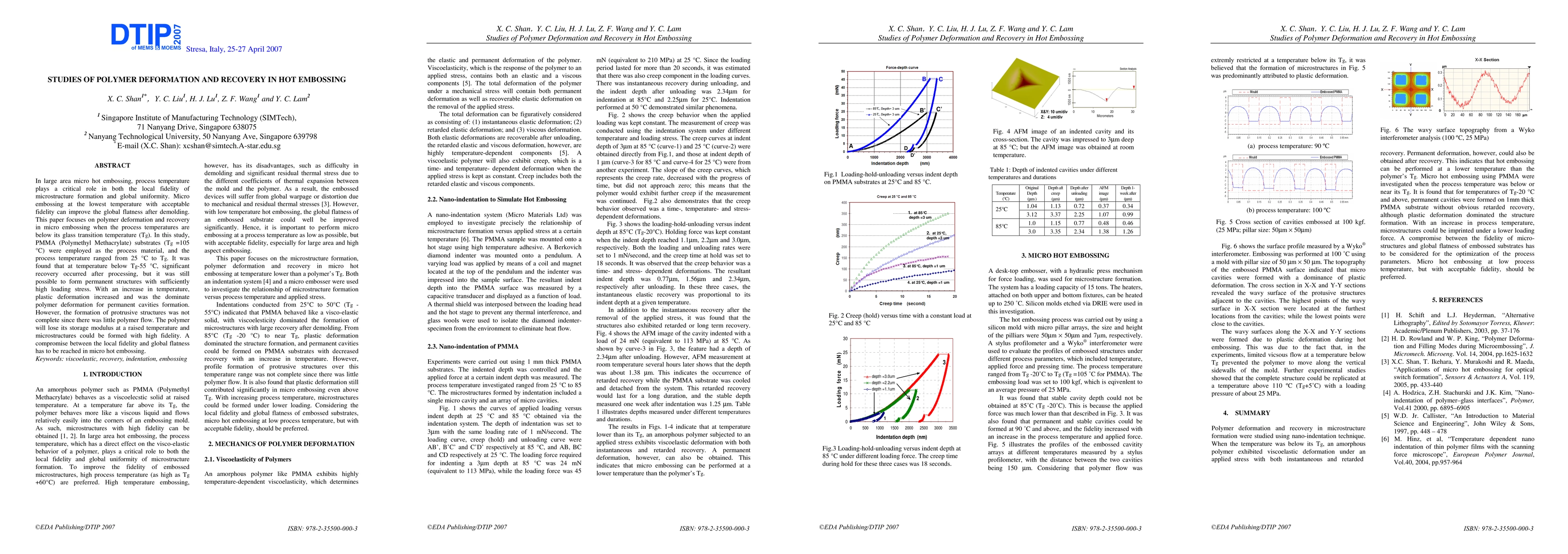 This paper investigates polymer deformation and recovery in micro hot embossing at temperatures below or near the glass transition temperature (Tg). It finds that elastic deformation dominates at Tg-55°C, leading to significant relaxation, while plastic deformation and permanent cavities form from Tg-20°C to Tg, with better microstructure formation at higher temperatures but lower loading pressures.