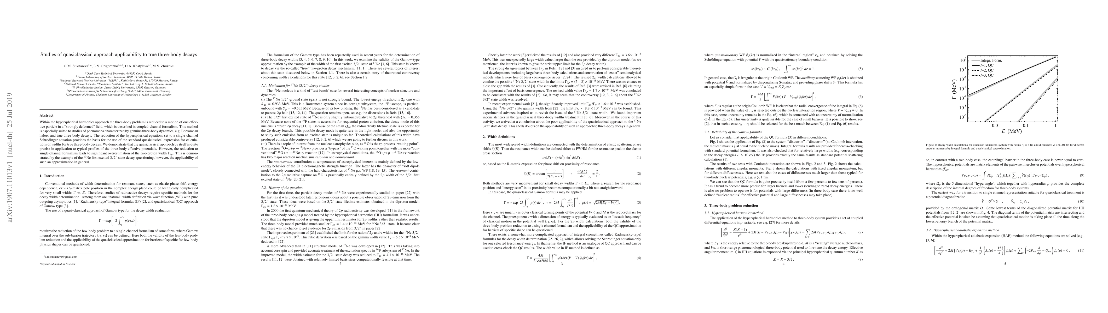 Within the hyperspherical harmonics approach the three-body problem is reduced to a motion of one effective particle in a "strongly deformed" field, which is described in coupled-channel formalism. This method is especially suited to studies of phenomena characterized by genuine three-body dynamics, e.g. Borromean haloes and true three-body decays. The reduction of the hyperspherical equations set to a single-channel Schr\"odinger equation provides the basis for the use of the standard quasiclassical expression for calculations of widths for true three-body decays. We demonstrate that the quasiclassical approach by itself is quite precise in application to typical profiles of the three-body effective potentials. However, the reduction to single-channel formalism leads to significant overestimation of the two-proton width $\Gamma_{2p}$. This is demonstrated by the example of the $^{17}$Ne first excited $3/2^-$ state decay, questioning, however, the applicability of such an approximation in general.