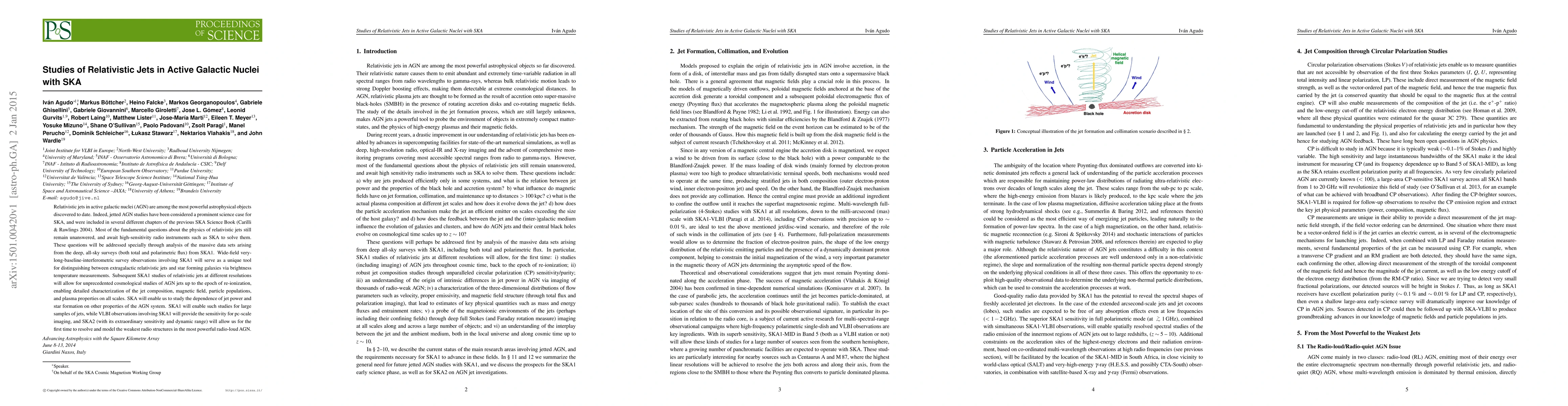Relativistic jets in active galactic nuclei (AGN) are among the most powerful astrophysical objects discovered to date. Indeed, jetted AGN studies have been considered a prominent science case for SKA, and were included in several different chapters of the previous SKA Science Book (Carilli & Rawlings 2004). Most of the fundamental questions about the physics of relativistic jets still remain unanswered, and await high-sensitivity radio instruments such as SKA to solve them. These questions will be addressed specially through analysis of the massive data sets arising from the deep, all-sky surveys (both total and polarimetric flux) from SKA1. Wide-field very-long-baseline-interferometric survey observations involving SKA1 will serve as a unique tool for distinguishing between extragalactic relativistic jets and star forming galaxies via brightness temperature measurements. Subsequent SKA1 studies of relativistic jets at different resolutions will allow for unprecedented cosmological studies of AGN jets up to the epoch of re-ionization, enabling detailed characterization of the jet composition, magnetic field, particle populations, and plasma properties on all scales. SKA will enable us to study the dependence of jet power and star formation on other properties of the AGN system. SKA1 will enable such studies for large samples of jets, while VLBI observations involving SKA1 will provide the sensitivity for pc-scale imaging, and SKA2 (with its extraordinary sensitivity and dynamic range) will allow us for the first time to resolve and model the weakest radio structures in the most powerful radio-loud AGN.