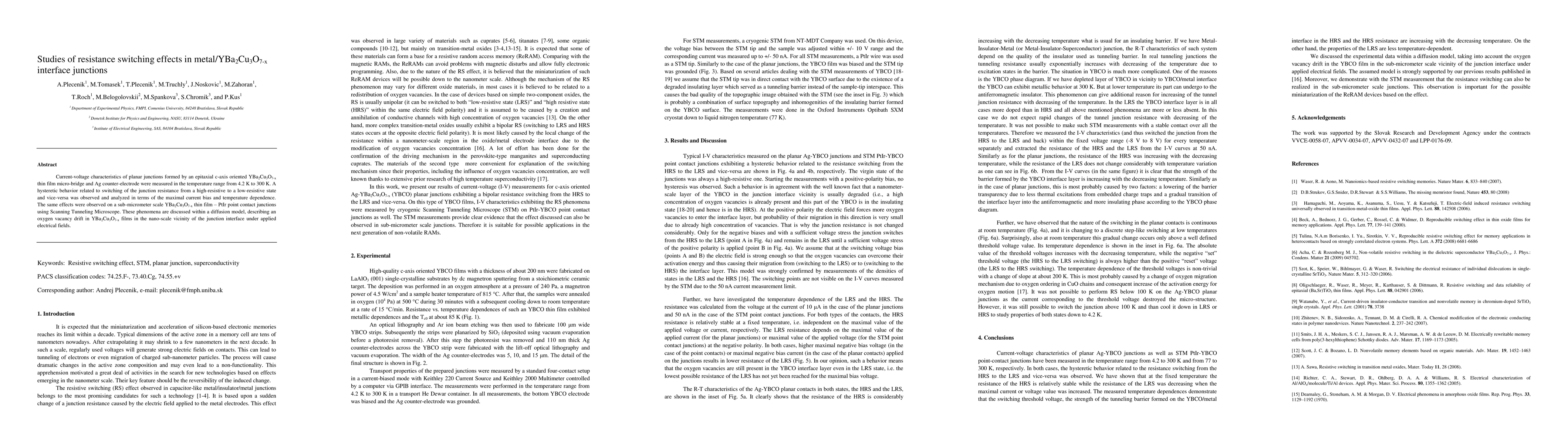 This paper investigates resistance switching in YBa2Cu3O7-x/Ag junctions and sub-micrometer YBa2Cu3O7-x/PtIr contacts, observing hysteretic behavior linked to resistance state changes. The phenomena are explained by a diffusion model involving oxygen vacancy drift in the YBa2Cu3O7-x film near the junction interface under electrical fields.