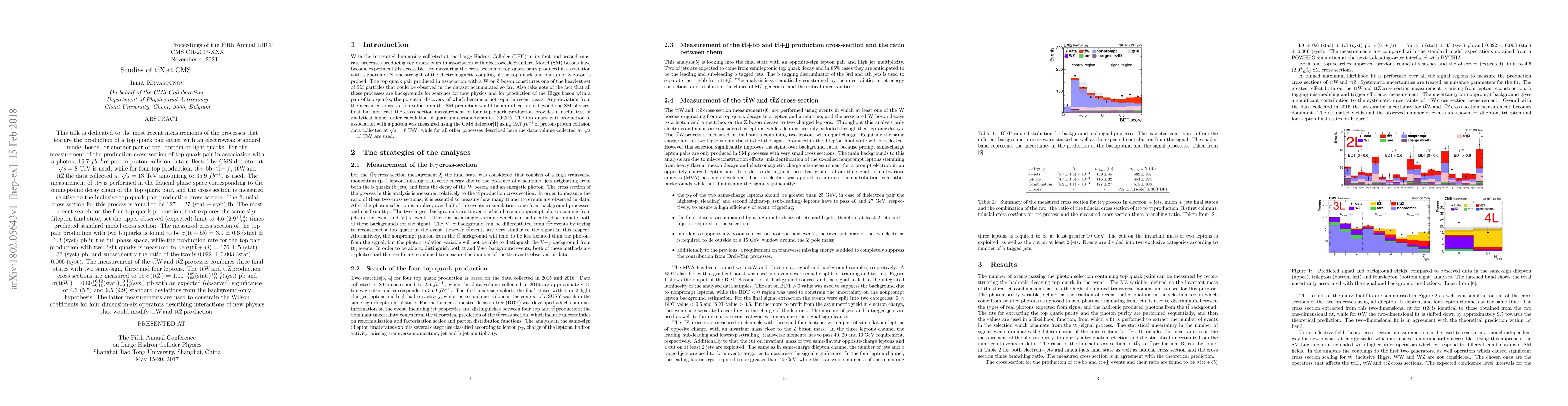 This talk is dedicated to the most recent measurements of the processes that feature the production of a top quark pair either with an electroweak standard model boson, or another pair of top, bottom or light quarks. For the measurement of the production cross-section of top quark pair in association with a photon, 19.7 $\rm fb^{-1}$ of proton-proton collision data collected by CMS detector at $\sqrt{s}$ = 8 TeV is used, while for four top production, $\rm t\bar{t}$ + bb, $\rm t\bar{t}$ + jj, $\rm t\bar{t}$W and $\rm t\bar{t}$Z the data collected at $\sqrt{s}$ = 13 TeV amounting to 35.9 $\rm fb^{-1}$, is used. The measurement of $\rm t\bar{t}\gamma$ is performed in the fiducial phase space corresponding to the semileptonic decay chain of the top quark pair, and the cross section is measured relative to the inclusive top quark pair production cross section. The fiducial cross section for this process is found to be 127 $\pm$ 27 (stat + syst) fb. The most recent search for the four top quark production, that explores the same-sign dilepton final state, set the upper observed (expected) limit to 4.6 ($2.9^{+1.4}_{-0.9}$) times predicted standard model cross section. The measured cross section of the top pair production with two b quarks is found to be $\sigma$($\rm t\bar{t}$ + bb) = 3.9 $\pm$ 0.6 (stat) $\pm$ 1.3 (syst) pb in the full phase space. The measurement of the $\rm t\bar{t}$W and $\rm t\bar{t}$Z processes combines three final states with two same-sign, three and four leptons. The $\rm t\bar{t}$W and $\rm t\bar{t}$Z production cross sections are measured to be $\sigma$($\rm t\bar{t}$Z) = $\rm 1.00^{+0.09}_{-0.08} (stat.)^{+0.12}_{-0.10} (sys.)$ pb and $\sigma$($\rm t\bar{t}$W) = $\rm 0.80^{+0.12}_{-0.11} (stat.)^{+0.13}_{-0.12} (sys.)$ pb with an expected (observed) significance of 4.6 (5.5) and 9.5 (9.9) standard deviations from the background-only hypothesis.