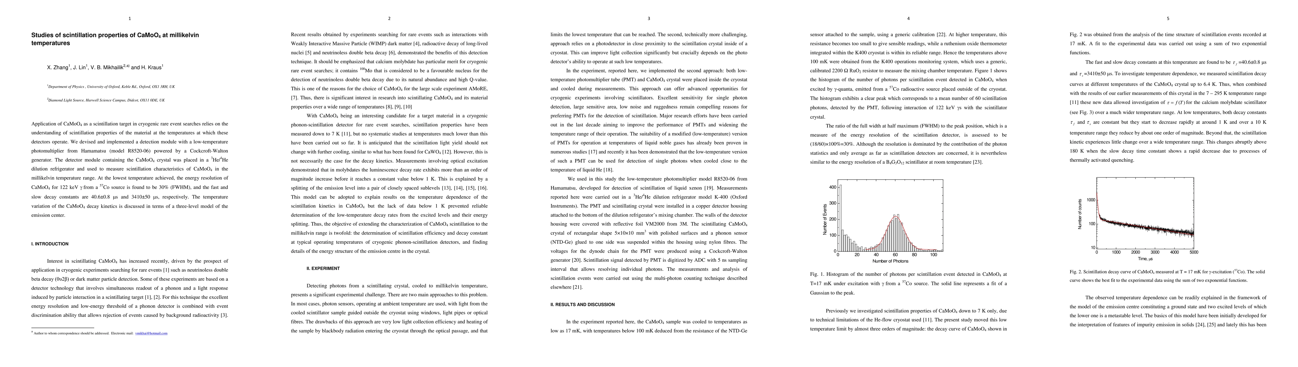 This study investigates the scintillation properties of CaMoO4 at millikelvin temperatures, crucial for its use in cryogenic rare event detection. The research found an energy resolution of 30% (FWHM) for 122 keV gamma rays and decay constants of 40.6±0.8 us and 3410±50 us, with temperature-dependent decay kinetics explained by a three-level emission model.