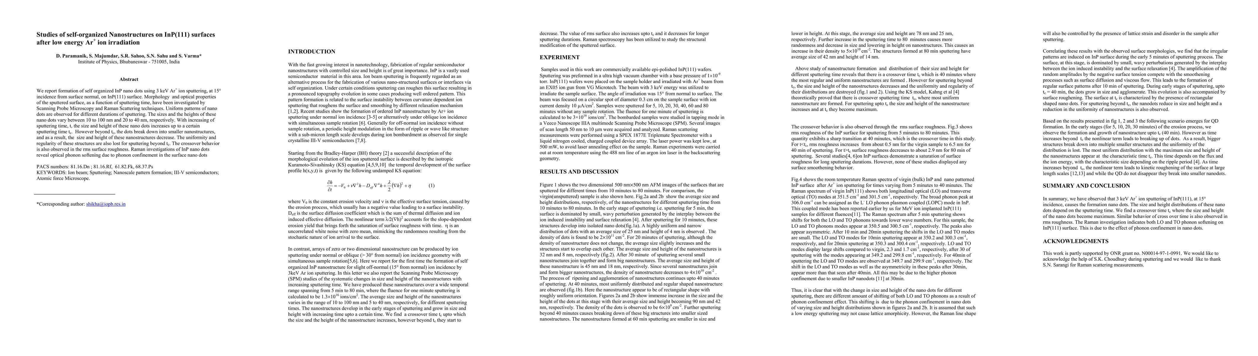 We report formation of self organized InP nano dots using 3 keV Ar+ ion sputtering, at $15^\circ$ incidence from surface normal, on InP(111) surface. Morphology and optical properties of the sputtered surface, as a function of sputtering time, have been investigated by Scanning Probe Microscopy and Raman Scattering techniques. Uniform patterns of nano dots are observed for different durations of sputtering. The sizes and the heights of these nano dots vary between 10 to 100 nm and 20 to 40 nm, respectively. With increasing of sputtering time, t, the size and height of these nano dots increases up to a certain sputtering time $t_c$. However beyond $t_c$, the dots break down into smaller nanostructures, and as a result, the size and height of these nanostructures decrease. The uniformity and regularity of these structures are also lost for sputtering beyond $t_c$. The crossover behavior is also observed in the rms surface roughness. Raman investigations of InP nano dots reveal optical phonon softening due to phonon confinement in the surface nano dots.