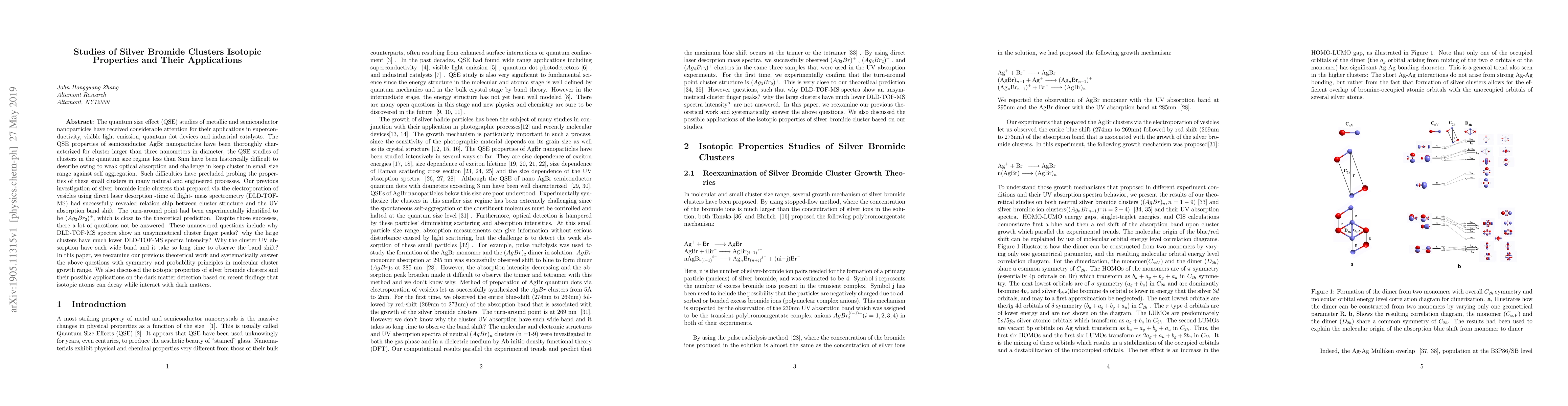 The quantum size effect (QSE) studies of metallic and semiconductor nanoparticles have received considerable attention for their applications in superconductivity, visible light emission, quantum dot devices and industrial catalysts. The QSE properties of semiconductor AgBr nanoparticles have been thoroughly characterized for cluster larger than three nanometers in diameter, the QSE studies of clusters in the quantum size regime less than 3nm have been historically difficult to describe owing to weak optical absorption and challenge in keep cluster in small size range against self aggregation. Such difficulties have precluded probing the properties of these small clusters in many natural and engineered processes. Our previous investigation of silver bromide ionic clusters that prepared via the electroporation of vesicles using direct laser desorption -- time of flight -- mass spectrometry (DLD-TOF-MS) had successfully revealed relation ship between cluster structure and the UV absorption band shift. The turn-around point had been experimentally identified to be $ (Ag_3Br_2)^+ $, which is close to the theoretical prediction. Despite those successes, there a lot of questions not be answered. These unanswered questions include why DLD-TOF-MS spectra show an unsymmetrical cluster finger peaks? why the large clusters have much lower DLD-TOF-MS spectra intensity? Why the cluster UV absorption have such wide band and it takes so long time to observe the band shift? In this paper, we reexamine our previous theoretical work and systematically answer the above questions with symmetry and probability principles in molecular cluster growth range. We also discussed the isotopic properties of silver bromide clusters and their possible applications on the dark matter detection based on recent findings that isotopic atoms can decay while interact with dark matters.