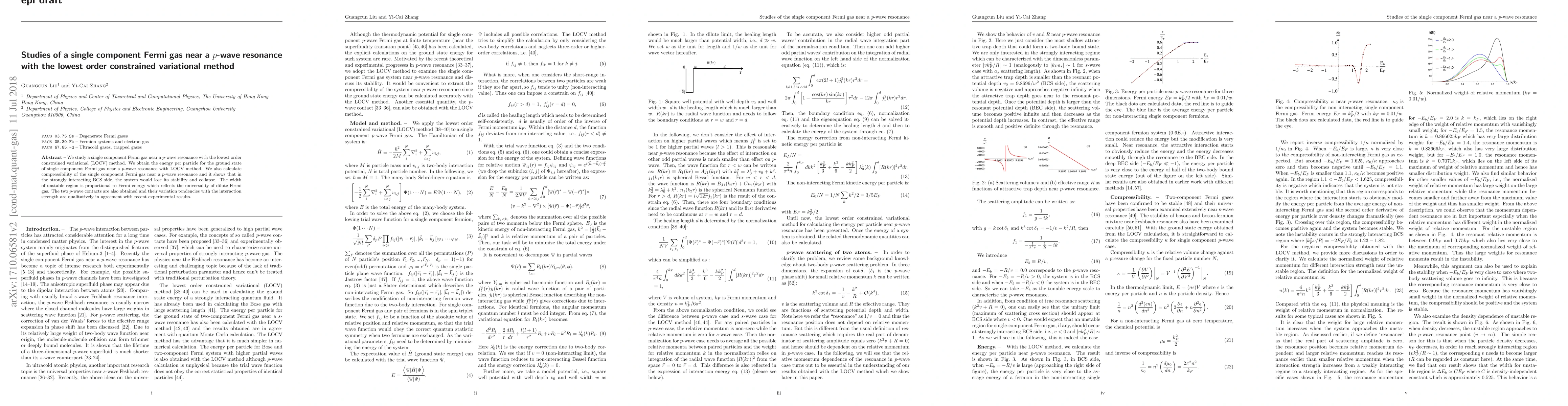 We study single component Fermi gas near a $p$-wave resonance with the lowest order constrained variational (LOCV) method. We obtain the energy per particle for the ground state of single component Fermi gas near a $p$-wave resonance with LOCV method. We also calculate compressibility of the single component Fermi gas near a $p$-wave resonance and it shows that near the $p$-wave resonance, the system would lose its stability and collapse. The two $p$-wave contacts are also obtained and their variation tendencies with interaction strength are consistent with recent experimental results.