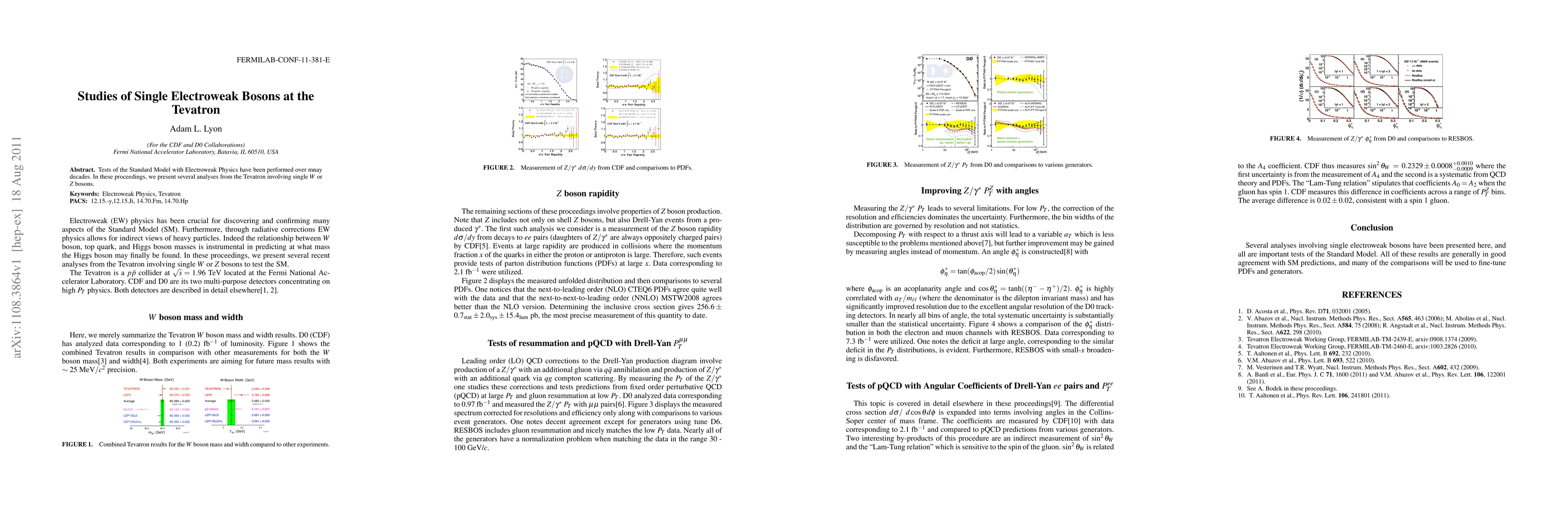 Tests of the Standard Model with Electroweak Physics have been performed over many decades. In these proceedings, we present several analyses from the Tevatron involving single $W$ or $Z$ bosons.