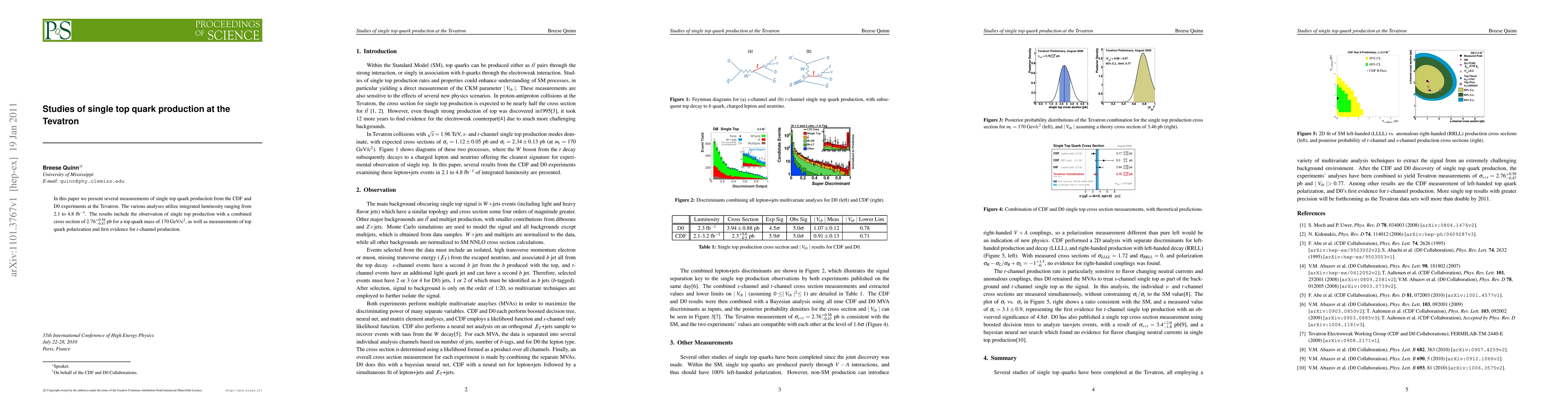 This paper reports on measurements from CDF and D0 experiments at the Tevatron, observing single top quark production with a combined cross section of 2.76 +0.58 -0.47 pb, and providing first evidence for t-channel production and measurements of top quark polarization.