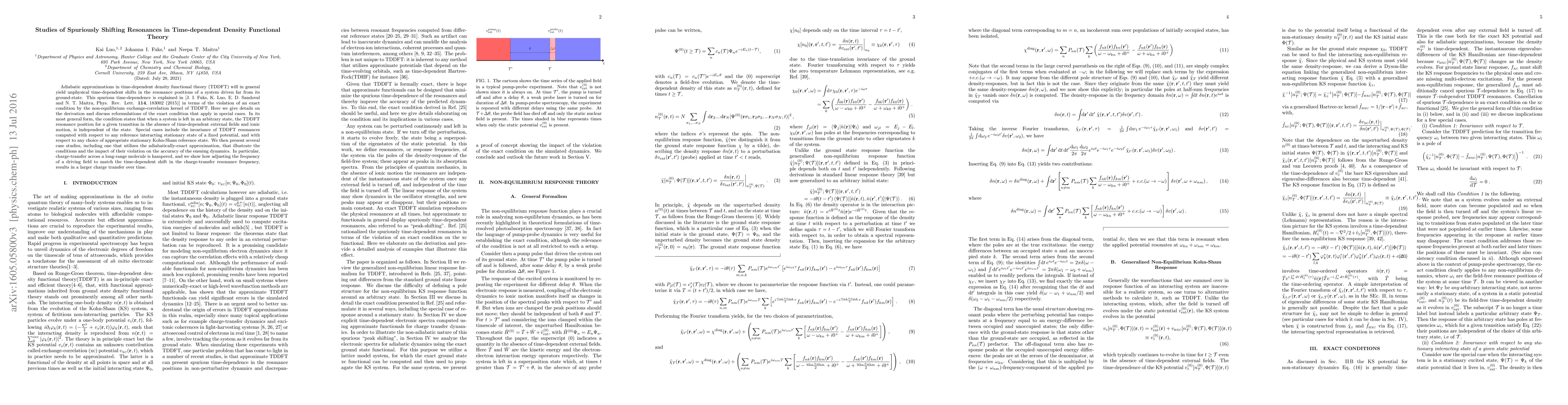 This paper investigates spurious shifts in resonance positions in time-dependent density functional theory (TDDFT) under adiabatic approximations, attributing them to violations of an exact condition. It provides detailed derivations and discusses special cases where TDDFT resonance positions remain invariant, illustrating the impact of these violations on charge-transfer dynamics in long-range molecules.