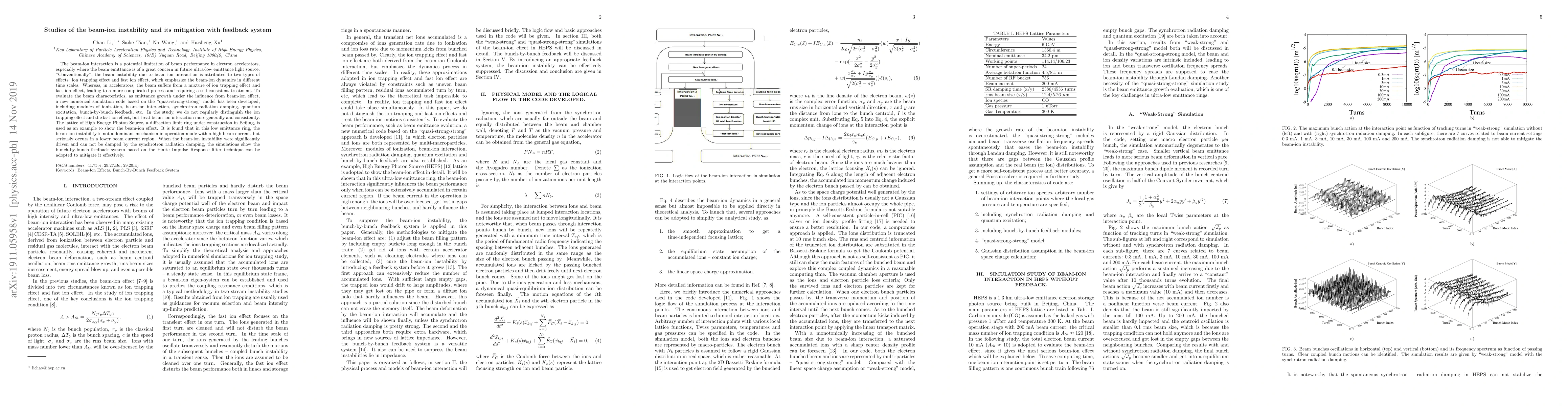 This paper investigates the beam-ion instability in electron accelerators, particularly focusing on its impact on beam emittance in future ultra-low emittance light sources. It develops a new simulation code to model the complex dynamics of beam-ion interactions and demonstrates that bunch-by-bunch feedback systems can effectively mitigate the instability, especially in low beam current regions.
