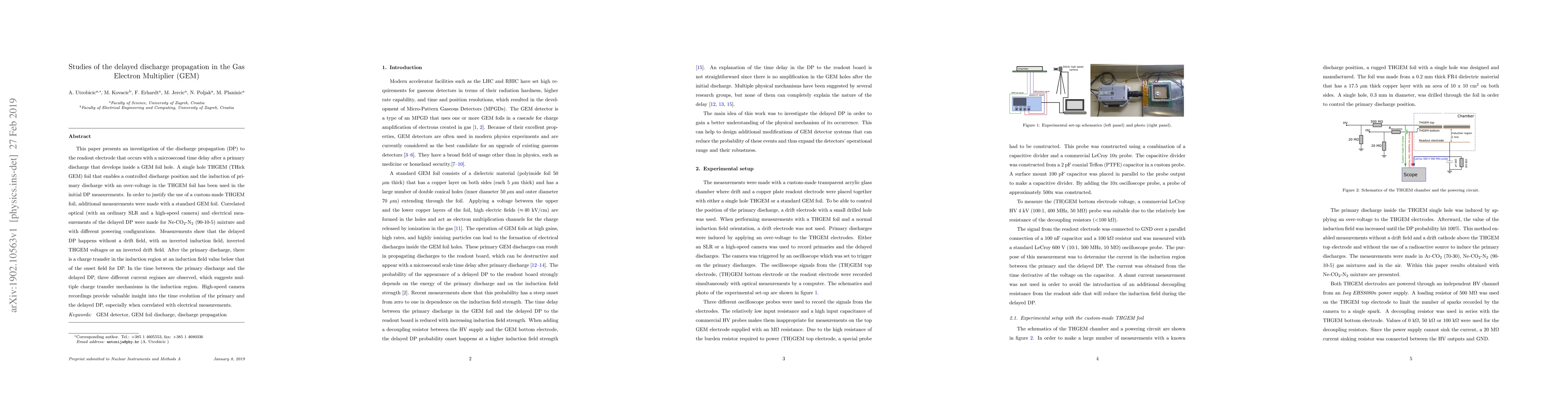 This paper presents an investigation of the discharge propagation (DP) to the readout electrode that occurs with a microsecond time delay after a primary discharge that develops inside a GEM foil hole. A single hole THGEM (THick GEM) foil that enables a controlled discharge position and the induction of primary discharge with an over-voltage in the THGEM foil has been used in the initial DP measurements. In order to justify the use of a custom-made THGEM foil, additional measurements were made with a standard GEM foil. Correlated optical (with an ordinary SLR and a high-speed camera) and electrical measurements of the delayed DP were made for Ne-CO$_2$-N$_2$ (90-10-5) mixture and with different powering configurations. Measurements show that the delayed DP happens without a drift field, with an inverted induction field, inverted THGEM voltages or an inverted drift field. After the primary discharge, there is a charge transfer in the induction region at an induction field value below that of the onset field for DP. In the time between the primary discharge and the delayed DP, three different current regimes are observed, which suggests multiple charge transfer mechanisms in the induction region. High-speed camera recordings provide valuable insight into the time evolution of the primary and the delayed DP, especially when correlated with electrical measurements.