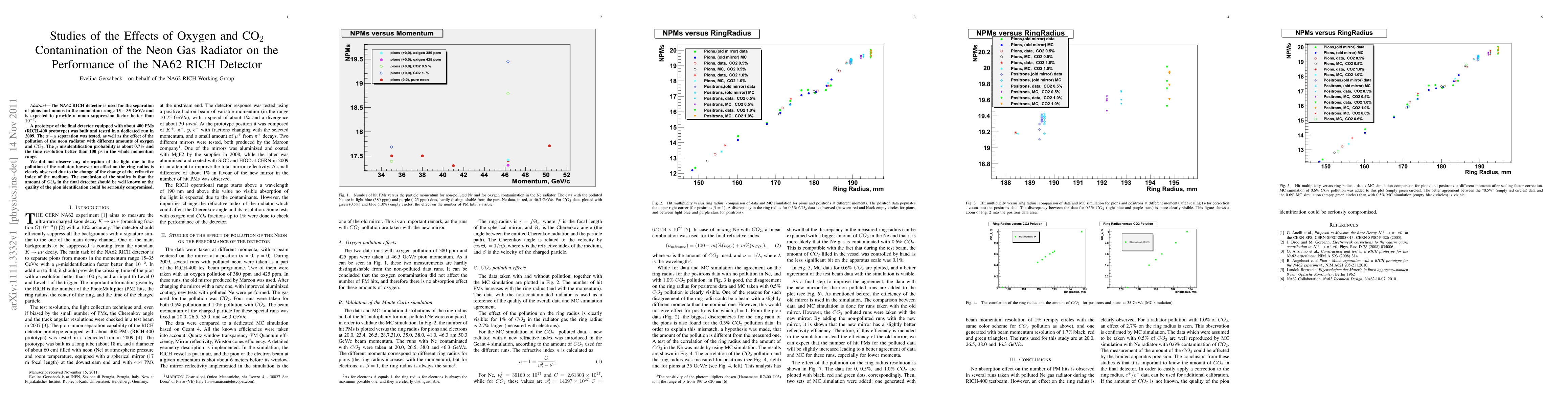 The NA62 RICH detector is used for the separation of pions and muons in the momentum range 15 -- 35 GeV/c and is expected to provide a muon suppression factor better than $10^{-2}$. A prototype of the final detector equipped with about 400 PMs (RICH-400 prototype) was built and tested in a dedicated run in 2009. The $\pi-\mu$ separation was tested, as well as the effect of the pollution of the neon radiator with different amounts of oxygen and CO_2. The $\mu$ misidentification probability is about 0.7% and the time resolution better than 100 ps in the whole momentum range. We did not observe any absorption of the light due to the pollution of the radiator, however an effect on the ring radius is clearly observed due to the change of the change of the refractive index of the medium. The conclusion of the studies is that the amount of CO_2 in the final detector should be well known or the quality of the pion identification could be seriously compromised.