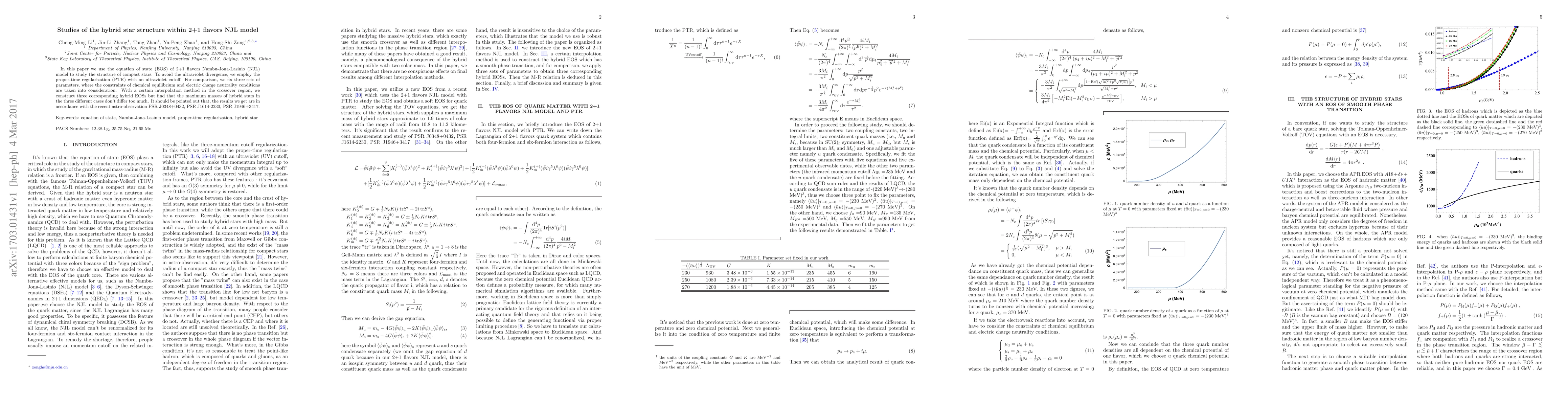 In this paper we use the equation of state (EOS) of 2+1 flavors Nambu-Jona-Lasinio (NJL) model to study the structure of compact stars. To avoid the ultraviolet divergence, we employ the proper-time regularization (PTR) with an ultraviolet cutoff. For comparison, we fix three sets of parameters, where the constraints of chemical equilibrium and electric charge neutrality conditions are taken into consideration. With a certain interpolation method in the crossover region, we construct three corresponding hybrid EOSs but find that the maximum masses of hybrid stars in the three different cases don't differ too much. It should be pointed out that, the results we get are in accordance with the recent astro-observation PSR J0348+0432, PSR J1614-2230, PSR J1946+3417.