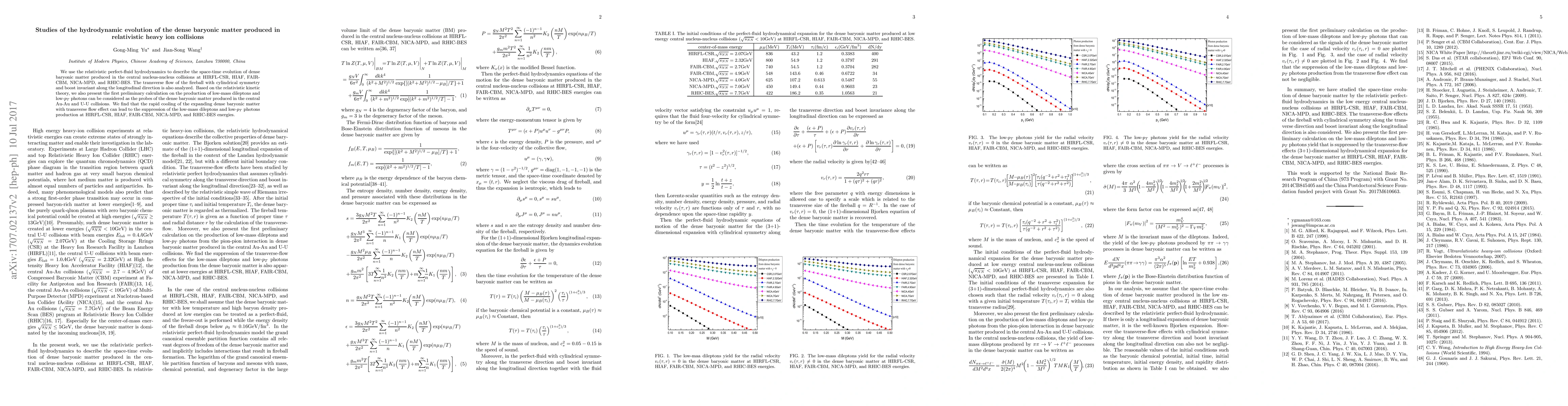 We use the relativistic perfect-fluid hydrodynamics to describe the space-time evolution of dense baryonic matter produced in the central nucleus-nucleus collisions at HIRFL-CSR, HIAF, FAIR-CBM, NICA-MPD, and RHIC-BES. The transverse flow of the fireball with cylindrical symmetry and boost invariant along the longitudinal direction is also analyzed. Based on the relativistic kinetic theory, we also present the first preliminary calculation on the production of low-mass dileptons and low-pT photons can be considered as the signals of the dense baryonic matter produced in the central Au-Au and U-U collisions. We find that the rapid cooling of the expanding dense baryonic matter with transverse flow effect can lead to the suppression of the low-mass dileptons and low-pT photons production at HIRFL-CSR, HIAF, FAIR-CBM, NICA-MPD, and RHIC-BES energies.