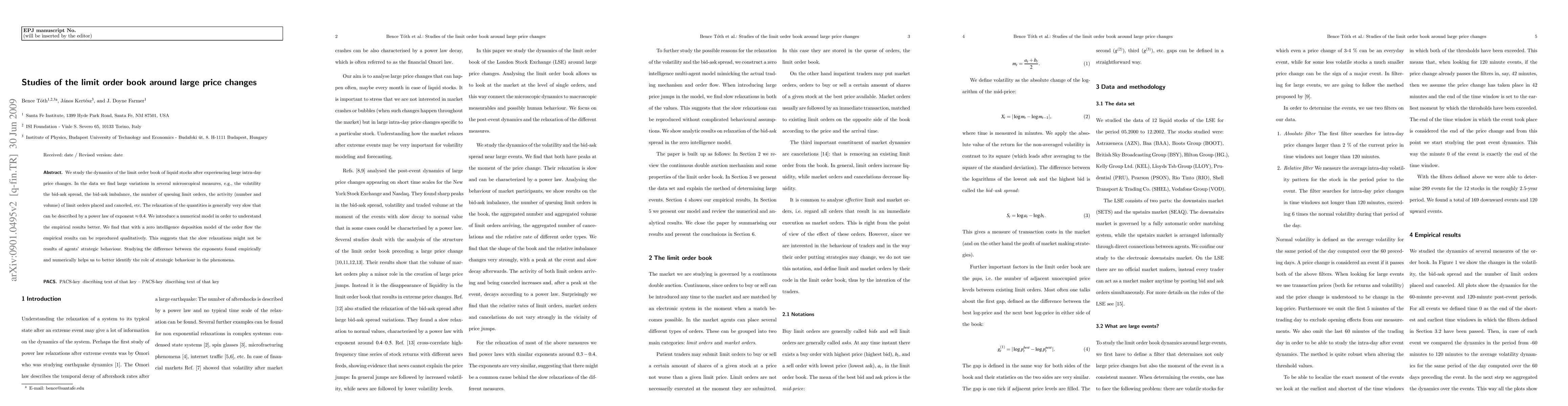 We study the dynamics of the limit order book of liquid stocks after experiencing large intra-day price changes. In the data we find large variations in several microscopical measures, e.g., the volatility the bid-ask spread, the bid-ask imbalance, the number of queuing limit orders, the activity (number and volume) of limit orders placed and canceled, etc. The relaxation of the quantities is generally very slow that can be described by a power law of exponent $\approx0.4$. We introduce a numerical model in order to understand the empirical results better. We find that with a zero intelligence deposition model of the order flow the empirical results can be reproduced qualitatively. This suggests that the slow relaxations might not be results of agents' strategic behaviour. Studying the difference between the exponents found empirically and numerically helps us to better identify the role of strategic behaviour in the phenomena.