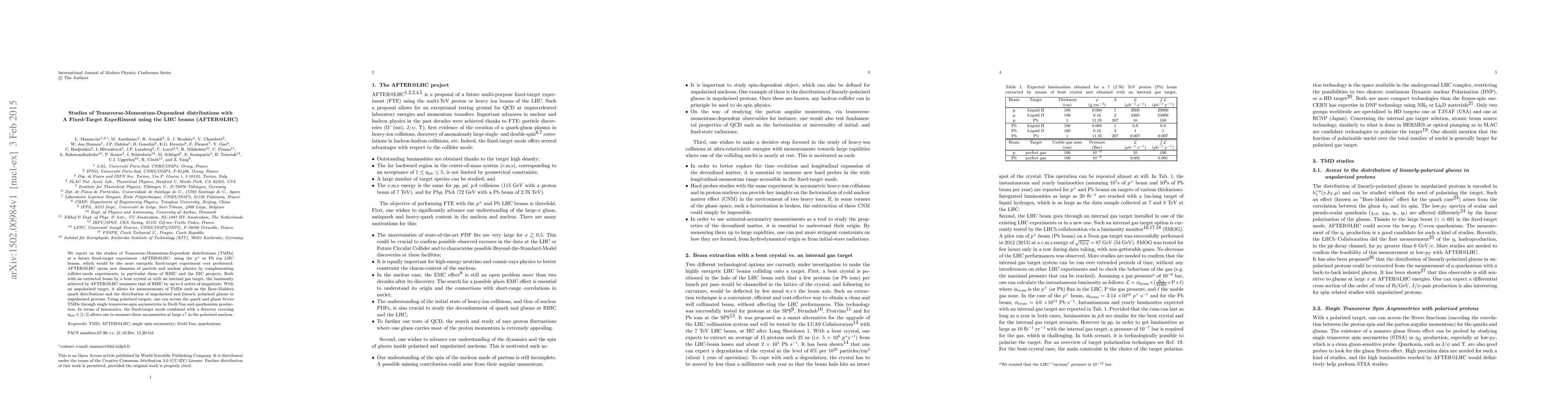 We report on the studies of Transverse-Momentum-Dependent distributions (TMDs) at a future fixed-target experiment --AFTER@LHC-- using the $p^+$ or Pb ion LHC beams, which would be the most energetic fixed-target experiment ever performed. AFTER@LHC opens new domains of particle and nuclear physics by complementing collider-mode experiments, in particular those of RHIC and the EIC projects. Both with an extracted beam by a bent crystal or with an internal gas target, the luminosity achieved by AFTER@LHC surpasses that of RHIC by up to 3 orders of magnitude. With an unpolarised target, it allows for measurements of TMDs such as the Boer-Mulders quark distributions and the distribution of unpolarised and linearly polarised gluons in unpolarised protons. Using polarised targets, one can access the quark and gluon Sivers TMDs through single transverse-spin asymmetries in Drell-Yan and quarkonium production. In terms of kinematics, the fixed-target mode combined with a detector covering $\eta_{\rm lab} \in [1,5]$ allows one to measure these asymmetries at large $x^\uparrow$ in the polarised nucleon.