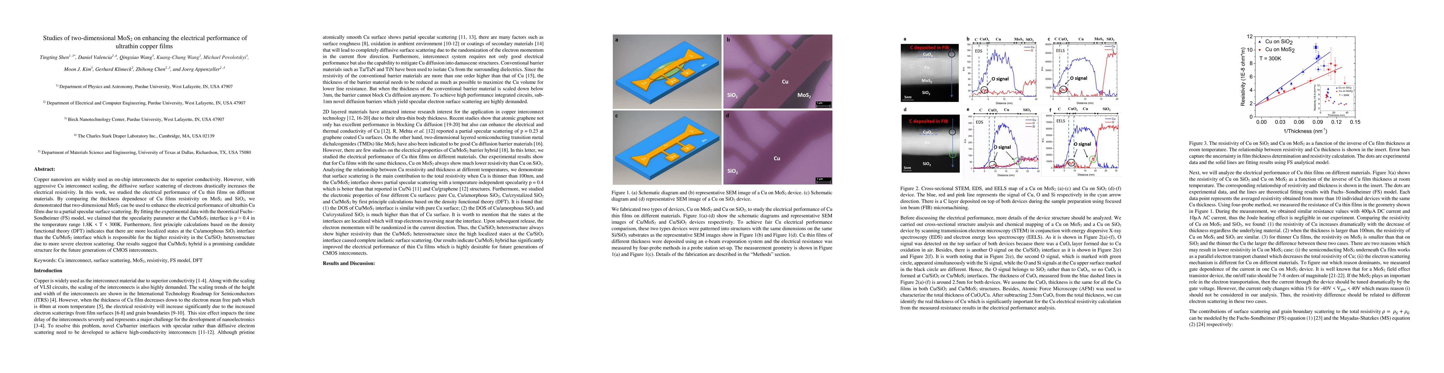 Copper nanowires are widely used as on-chip interconnects due to superior conductivity. However, with aggressive Cu interconnect scaling, the diffusive surface scattering of electrons drastically increases the electrical resistivity. In this work, we studied the electrical performance of Cu thin films on different materials. By comparing the thickness dependence of Cu films resistivity on MoS2 and SiO2, we demonstrated that two-dimensional MoS2 can be used to enhance the electrical performance of ultrathin Cu films due to a partial specular surface scattering. By fitting the experimental data with the theoretical Fuchs Sondheimer model, we obtained the specularity parameter at the Cu MoS2 interface in the temperature range 2K to 300K. Furthermore, first principle calculations based on the density functional theory indicates that there are more localized states at the Cu amorphous SiO2 interface than the Cu MoS2 interface which is responsible for the higher resistivity in the Cu SiO2 heterostructure due to more severe electron scattering. Our results suggest that Cu MoS2 hybrid is a promising candidate structure for the future generations of CMOS interconnects.