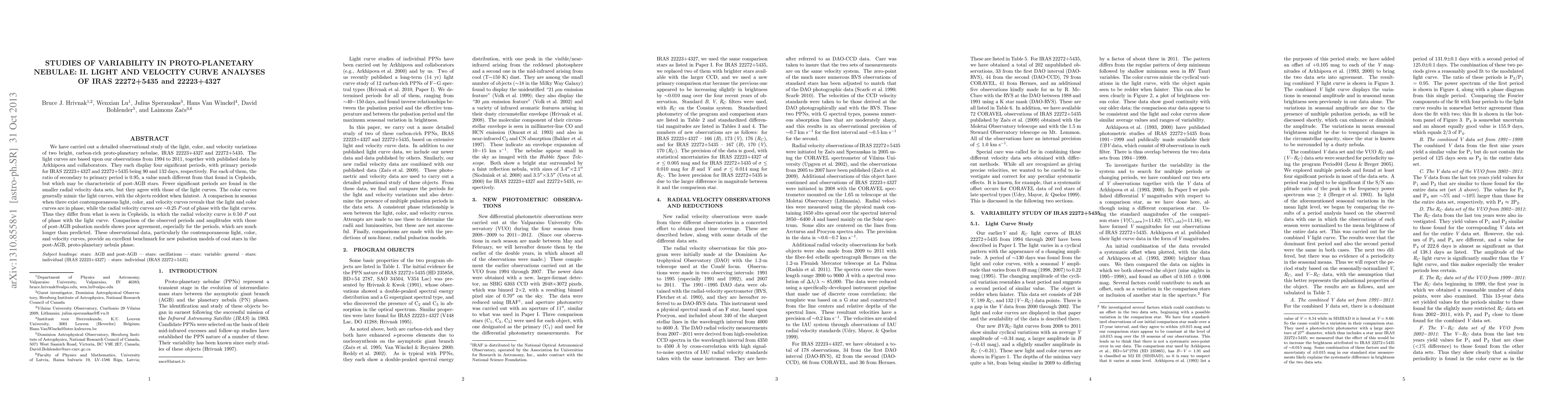 This study analyzes light and velocity variations in two carbon-rich proto-planetary nebulae, finding four significant periods with primary periods of 90 and 132 days, respectively. The light and color curves are in phase, while velocity curves are 0.25 out of phase, differing from Cepheids. The observed periods are much longer than predicted by post-AGB pulsation models.