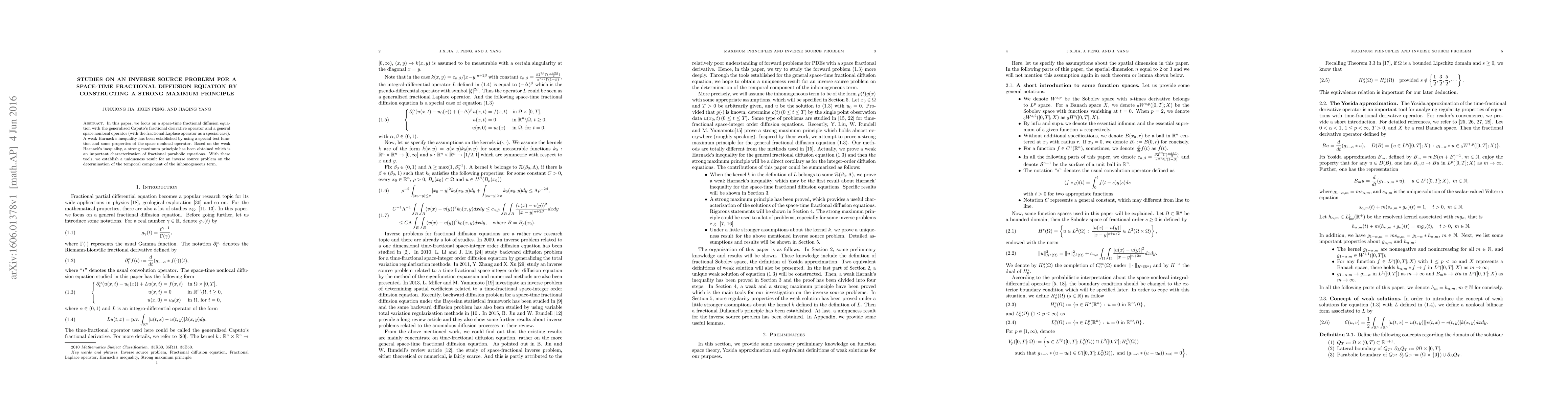 In this paper, we focus on a space-time fractional diffusion equation with the generalized Caputo's fractional derivative operator and a general space nonlocal operator (with the fractional Laplace operator as a special case). A weak Harnack's inequality has been established by using a special test function and some properties of the space nonlocal operator. Based on the weak Harnack's inequality, a strong maximum principle has been obtained which is an important characterization of fractional parabolic equations. With these tools, we establish a uniqueness result for an inverse source problem on the determination of the temporal component of the inhomogeneous term.