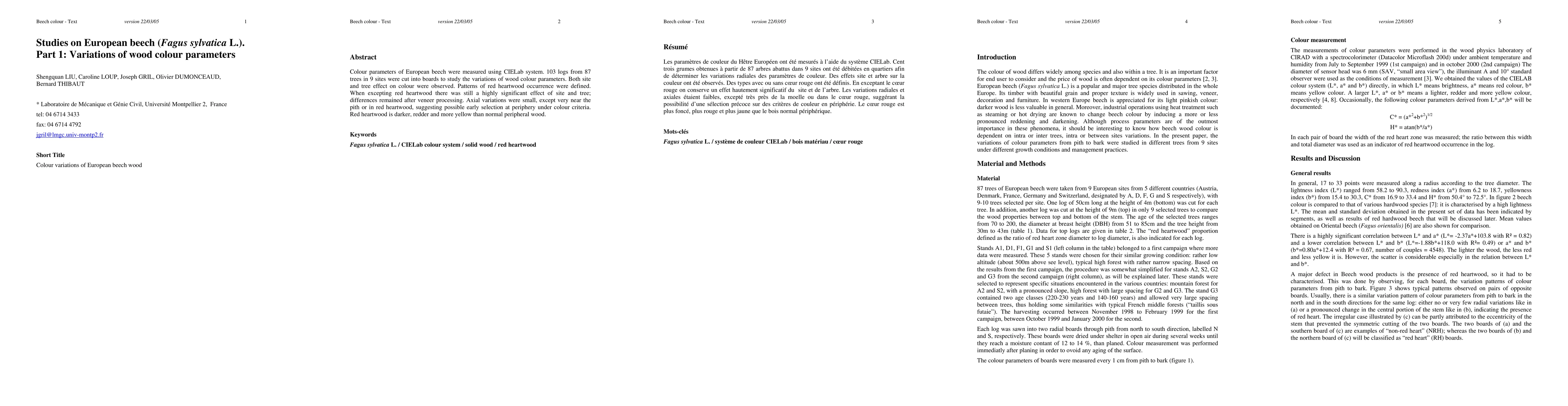 Colour parameters of European beech were measured using CIELab system. 103 logs from 87 trees in 9 sites were cut into boards to study the variations of wood colour parameters. Both site and tree effect on colour were observed. Patterns of red heartwood occurrence were defined. When excepting red heartwood there was still a highly significant effect of site and tree; differences remained after veneer processing. Axial variations were small, except very near the pith or in red heartwood, suggesting possible early selection at periphery under colour criteria. Red heartwood is darker, redder and more yellow than normal peripheral wood.