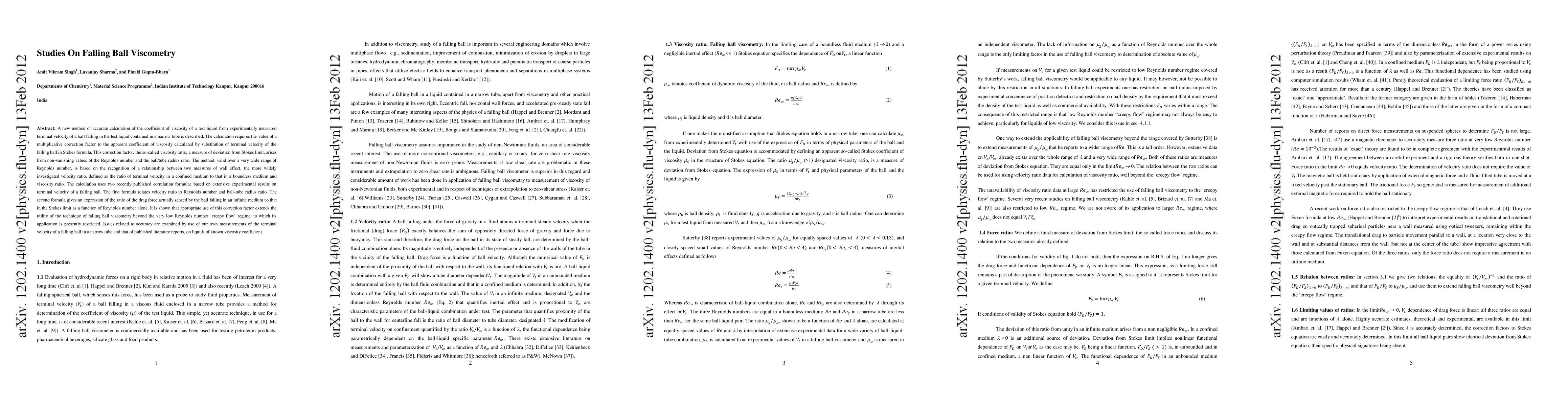 A new method of accurate calculation of the coefficient of viscosity of a test liquid from experimentally measured terminal velocity of a ball falling in the test liquid contained in a narrow tube is described. The calculation requires the value of a multiplicative correction factor to the apparent coefficient of viscosity calculated by substitution of terminal velocity of the falling ball in Stokes formula. This correction factor, the so-called viscosity ratio, a measure of deviation from Stokes limit, arises from non-vanishing values of the Reynolds number and the ball/tube radius ratio. The method, valid over a very wide range of Reynolds number, is based on the recognition of a relationship between two measures of wall effect, the more widely investigated velocity ratio, defined as the ratio of terminal velocity in a confined medium to that in a boundless medium and viscosity ratio. The calculation uses two recently published correlation formulae based on extensive experimental results on terminal velocity of a falling ball. The first formula relates velocity ratio to Reynolds number and ball-tube radius ratio. The second formula gives an expression of the ratio of the drag force actually sensed by the ball falling in an infinite medium to that in the Stokes limit as a function of Reynolds number alone. It is shown that appropriate use of this correction factor extends the utility of the technique of falling ball viscometry beyond the very low Reynolds number 'creepy flow' regime, to which its application is presently restricted. Issues related to accuracy are examined by use of our own measurements of the terminal velocity of a falling ball in a narrow tube and that of published literature reports, on liquids of known viscosity coefficient.