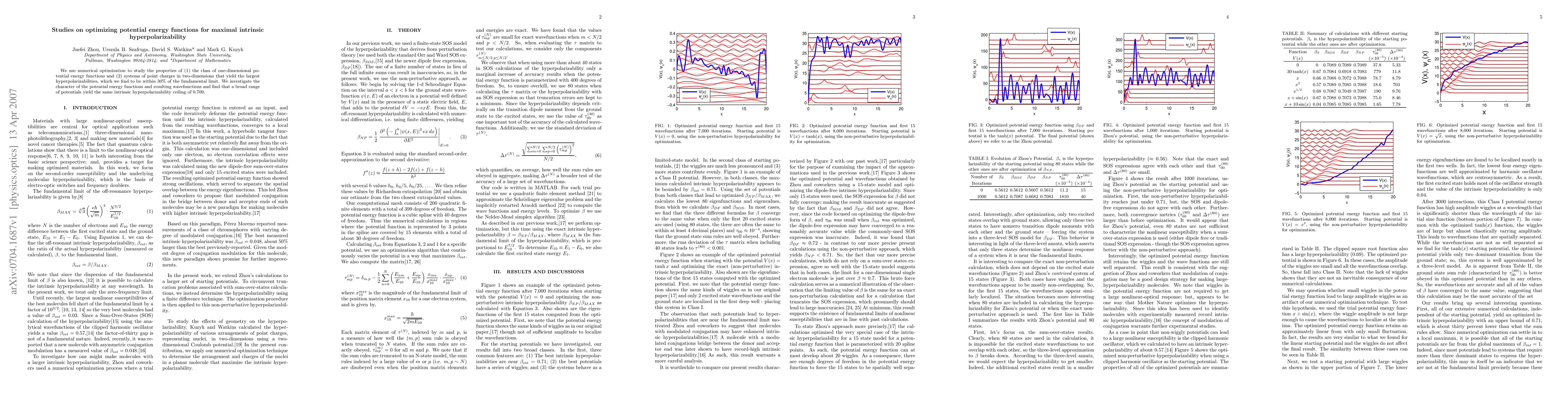 This study employs numerical optimization to identify one-dimensional potential energy functions and two-dimensional point charge systems that maximize intrinsic hyperpolarizability, achieving values within 30% of the fundamental limit. The research reveals that a variety of potential energy functions converge to an intrinsic hyperpolarizability ceiling of 0.709.