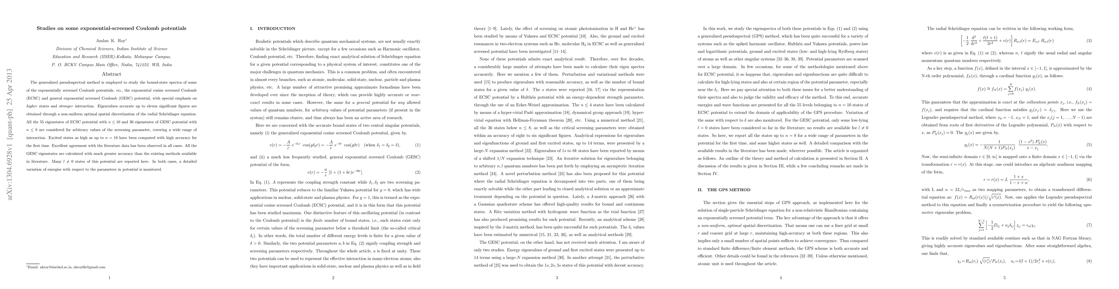 The generalized pseudospectral method is employed to study the bound-state spectra of some of the exponentially screened Coulomb potentials, \emph{viz.}, the exponential cosine screened Coulomb (ECSC) and general exponential screened Coulomb (GESC) potential, with special emphasis on \emph{higher} states and \emph{stronger} interaction. Eigenvalues accurate up to eleven significant figures are obtained through a non-uniform optimal spatial discretization of the radial Schr\"odinger equation. All the 55 eigenstates of ECSC potential with $n \le 10$ and 36 eigenstates of GESC potential with $n \le 8$ are considered for arbitrary values of the screening parameter, covering a wide range of interaction. Excited states as high as up to $n=18$ have been computed with high accuracy for the first time. Excellent agreement with the literature data has been observed in all cases. All the GESC eigenstates are calculated with much greater accuracy than the existing methods available in literature. Many $l \ne 0$ states of this potential are reported here. In both cases, a detailed variation of energies with respect to the parameters in potential is monitored.