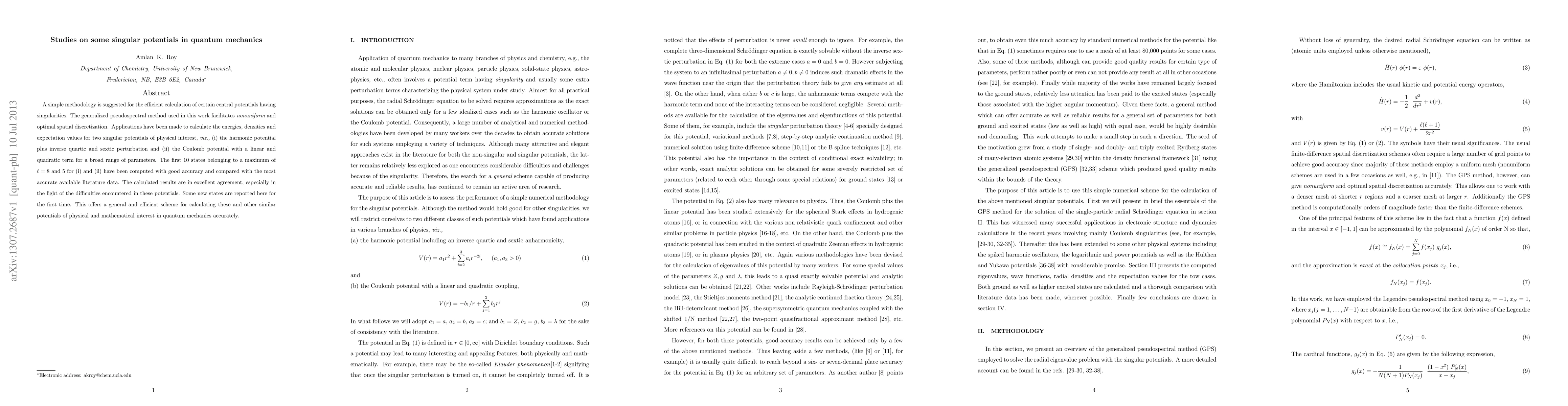 A simple methodology is suggested for the efficient calculation of certain central potentials having singularities. The generalized pseudospectral method used in this work facilitates {\em nonuniform} and optimal spatial discretization. Applications have been made to calculate the energies, densities and expectation values for two singular potentials of physical interest, {\em viz.,} (i) the harmonic potential plus inverse quartic and sextic perturbation and (ii) the Coulomb potential with a linear and quadratic term for a broad range of parameters. The first 10 states belonging to a maximum of $\ell=8$ and 5 for (i) and (ii) have been computed with good accuracy and compared with the most accurate available literature data. The calculated results are in excellent agreement, especially in the light of the difficulties encountered in these potentials. Some new states are reported here for the first time. This offers a general and efficient scheme for calculating these and other similar potentials of physical and mathematical interest in quantum mechanics accurately.