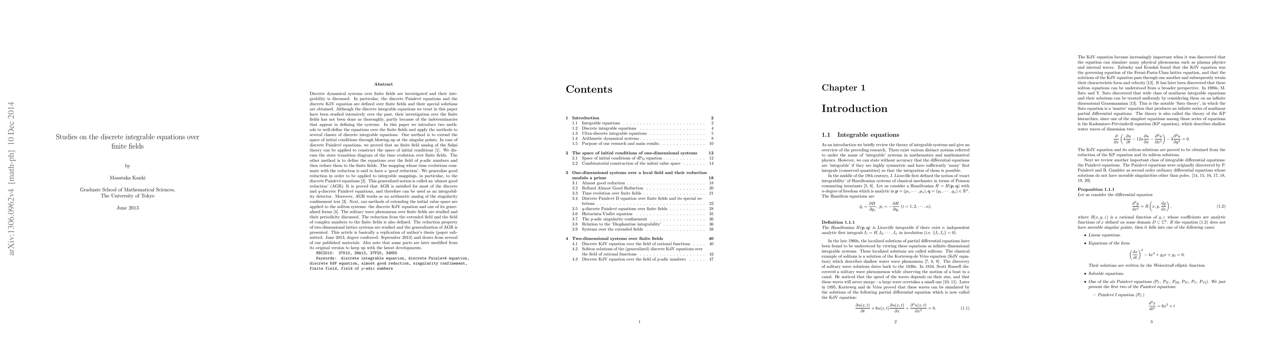 Discrete dynamical systems over finite fields are investigated and their integrability is discussed. In particular, the discrete Painlev\'{e} equations and the discrete KdV equation are defined over finite fields and their special solutions are obtained. Their investigation over the finite fields has not been done thoroughly, partly because of the indeterminacies that appear in defining the equations. In this paper we introduce two methods to well-define the equations over the finite fields and apply the methods to several classes of discrete integrable equations. One method is to extend the space of initial conditions through blowing-up at the singular points. In case of discrete Painlev\'{e} equations, we prove that an finite field analog of the Sakai theory can be applied to construct the space of initial conditions. The other method is to define the equations over the field of $p$-adic numbers and then reduce them to the finite fields. The mapping whose time evolutions commute with the reduction is said to have a `good reduction'. We generalize good reduction in order to be applied to integrable mappings. The generalized good reduction is formulated as `almost good reduction' and is proved to be a $p$-adic analog of the singularity confinement test. (*Note that this paper is intended for the author's thesis and it draws from several of our already published papers. Also note that several minor modifications have been made from the original thesis.)