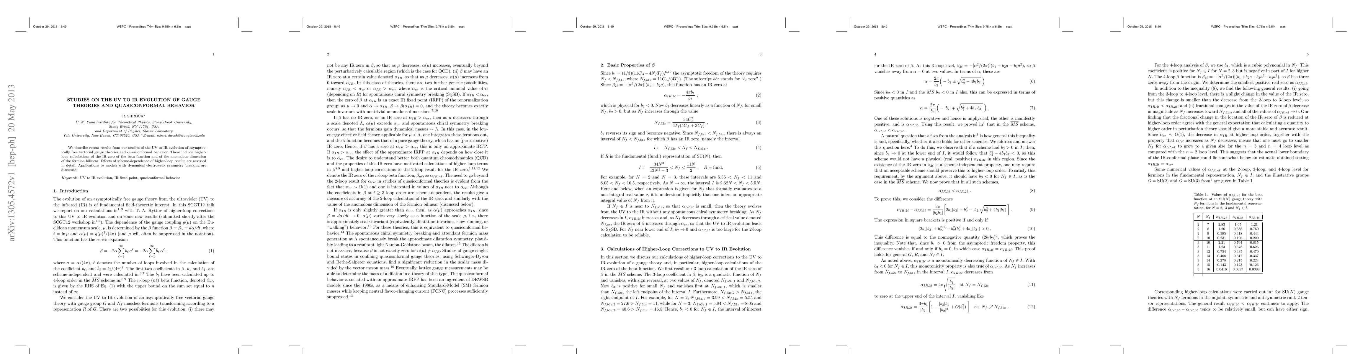 We describe recent results from our studies of the UV to IR evolution of asymptotically free vectorial gauge theories and quasiconformal behavior. These include higher-loop calculations of the IR zero of the beta function and of the anomalous dimension of the fermion bilinear. Effects of scheme-dependence of higher-loop results are assessed in detail. Applications to models with dynamical electroweak symmetry breaking are discussed.