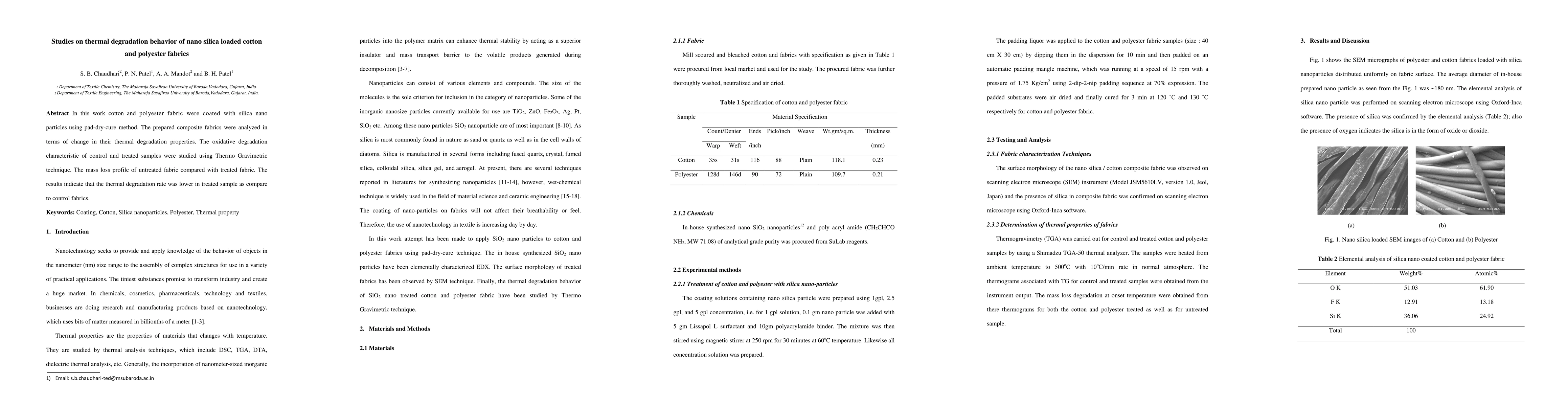 Summary: This study investigates the thermal degradation behavior of cotton and polyester fabrics coated with silica nanoparticles using the pad-dry-cure method. Results from Thermo Gravimetric analysis show that the thermal degradation rate of treated fabrics is significantly lower compared to untreated control fabrics.