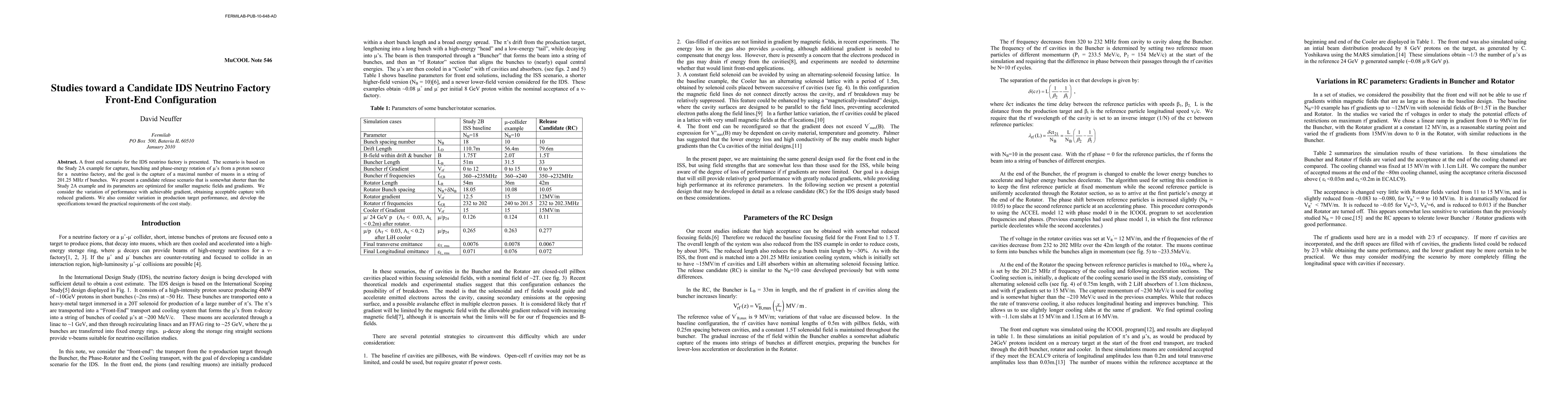A front end scenario for the IDS neutrino factory is presented. The scenario is based on the Study 2A example for capture, bunching and phase-energy rotation of muons from a proton source for a neutrino factory, and the goal is the capture of a maximal number of muons in a string of 201.25 MHz rf bunches. We present a candidate release scenario that is somewhat shorter than the Study 2A example and its parameters are optimized for smaller magnetic fields and gradients. We consider the variation of performance with achievable gradient, obtaining acceptable capture with reduced gradients. We also consider variation in production target performance, and develop the specifications toward the practical requirements of the cost study.